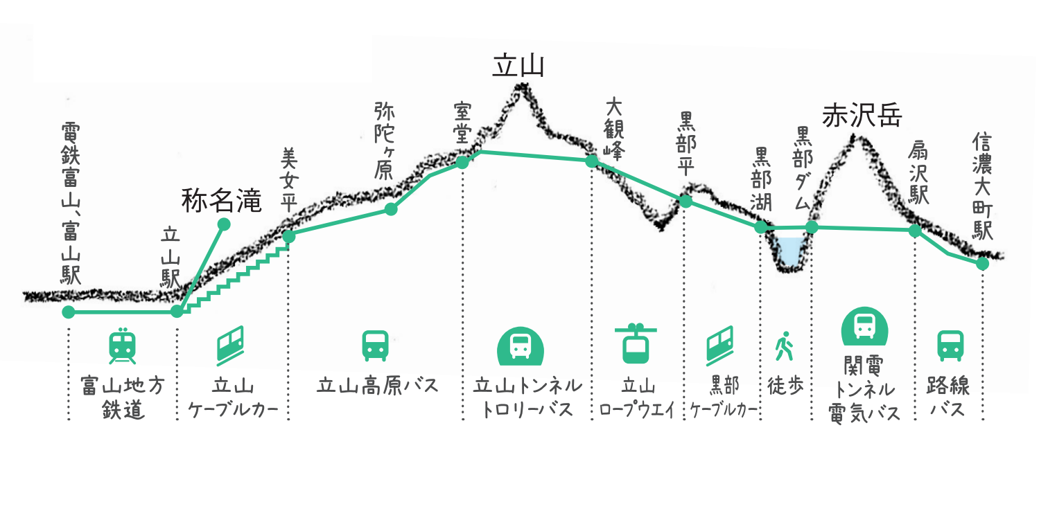 JR富山駅に隣接する富山地方鉄道の電鉄富山駅から立山線を利用すれば、普通電車の場合、約1時間で立山駅に到着します。 -