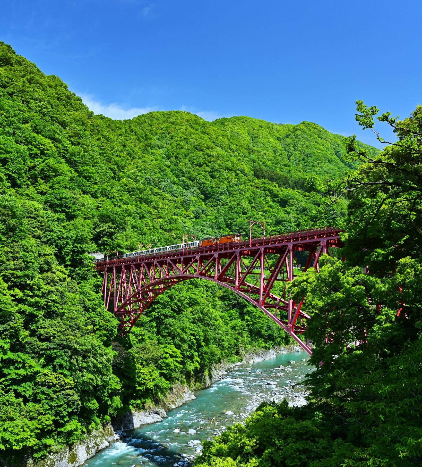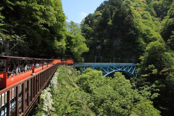日本有数の透明度を誇る宇奈月温泉には、黒部峡谷鉄道トロッコ電車の始発駅があります。黒薙駅まではトロッコ電車で25分ほど。そばには高さ60mの後曳橋が架かり、スリリングな景色も楽しめます。