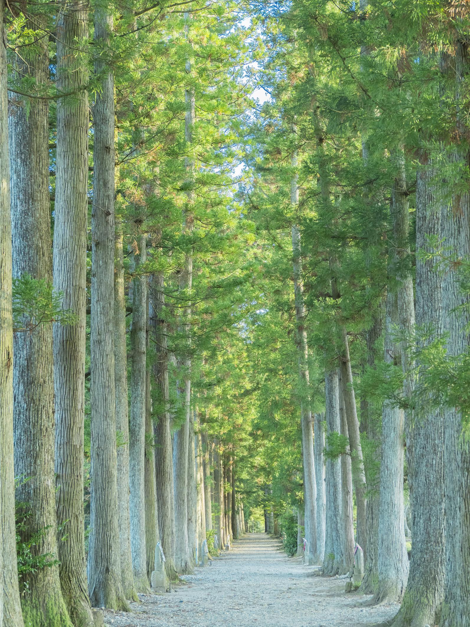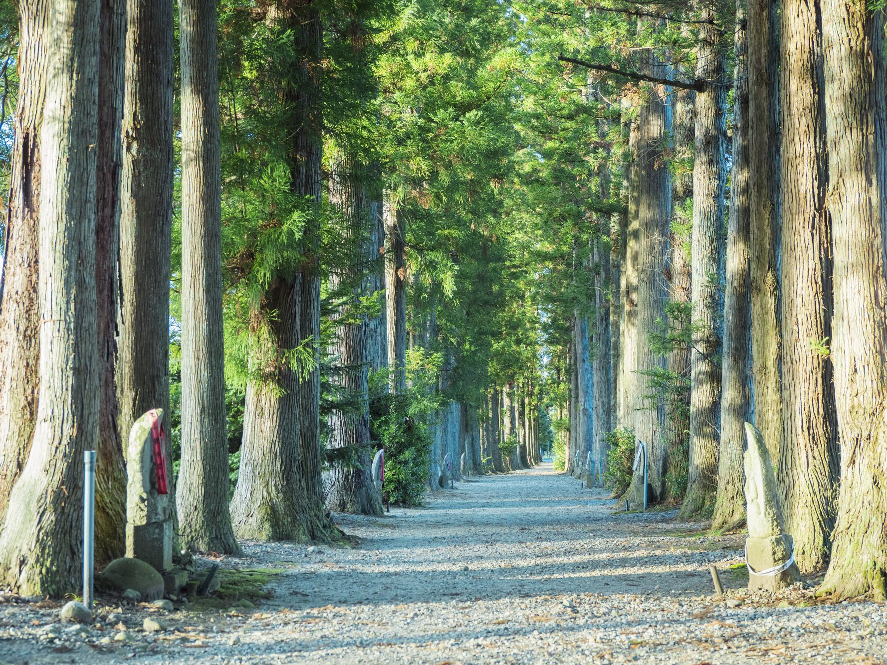 木漏れ日が降り注ぐ、参道を歩く 眼目山 立山寺