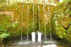 まずは、白衣に着替え六本滝で滝行を体験!6つの龍頭から流れ落ちる六本滝は、人々の六根(眼根、耳根、鼻根、舌根、身根、意根)を清浄にし、一切の衆生の六欲、根本煩悩を洗い落とすとされています。いざ、滝を目の前にすると勢いに圧倒されますが、終った後はとてもすっきりとした気持ちになれます。冷たい水に打たれ身を清めましょう!