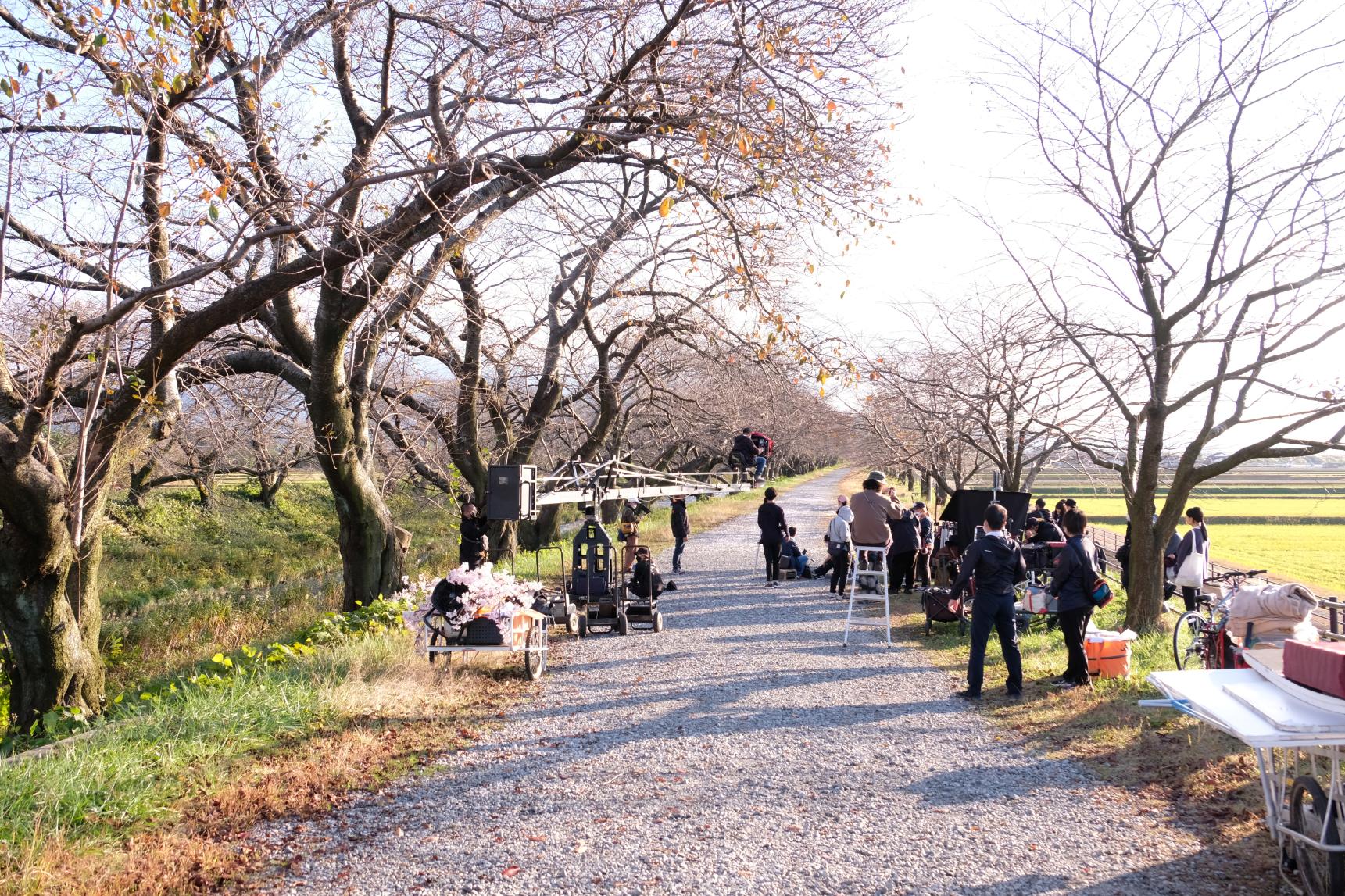美術スタッフが用意した、装飾用の桜の木の枝や水溶性の花びらを使用して、“桜の花びらが舞い散る桜並木” を演出されました。