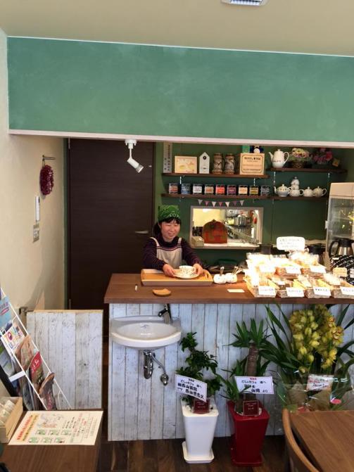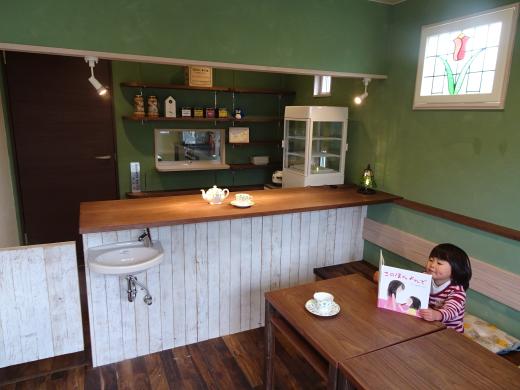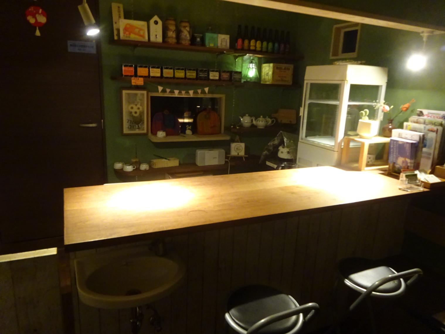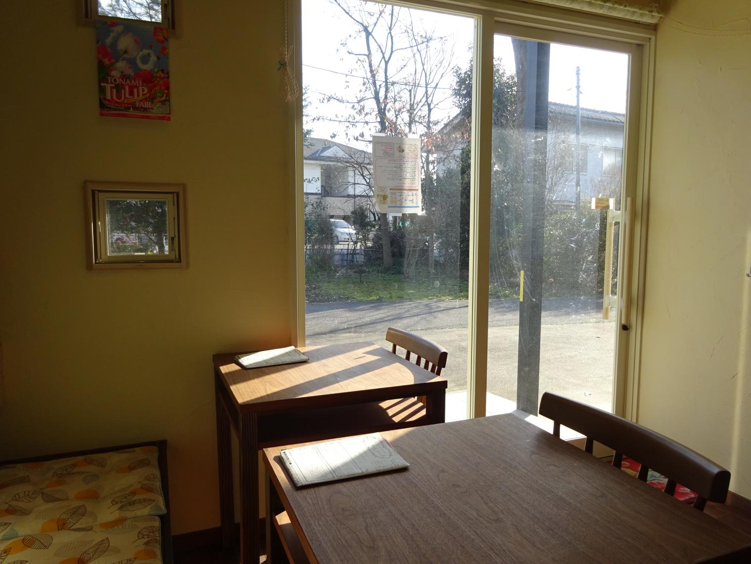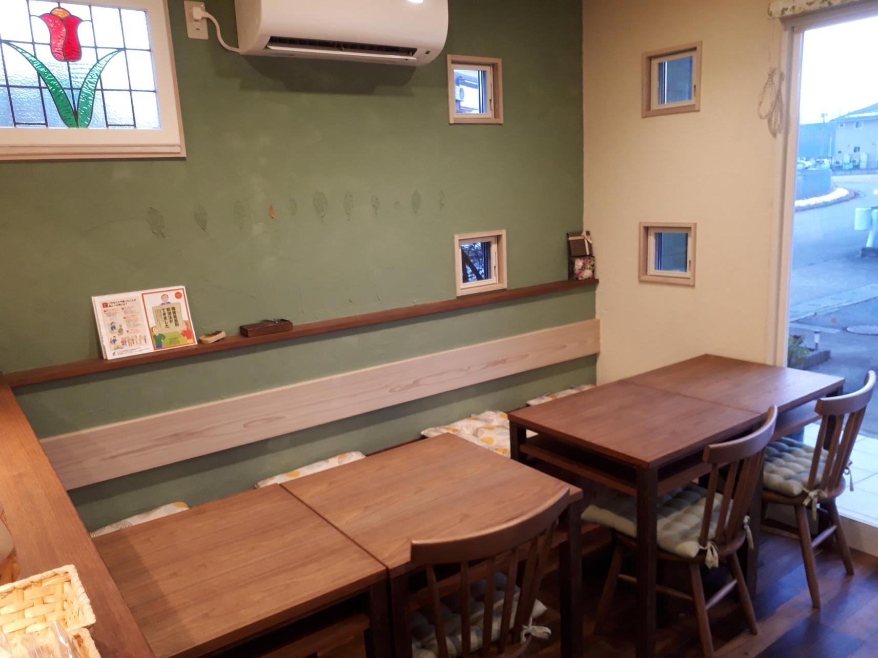 緑と白で塗られた壁や木目調の家具に、窓からやわらかい光が差し込んで落ち着いた雰囲気。
