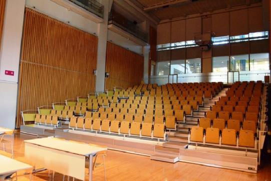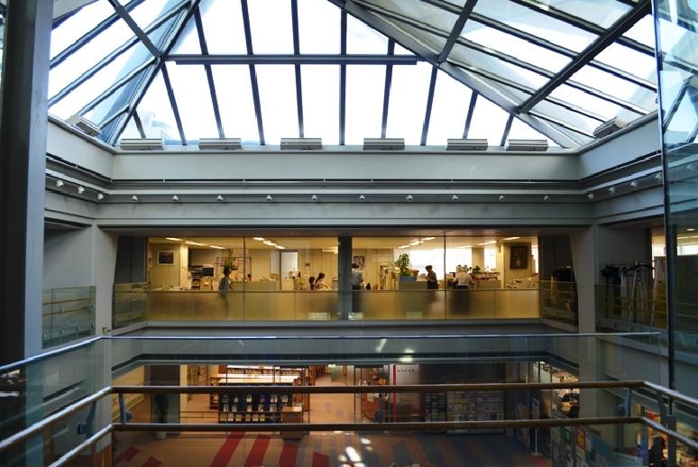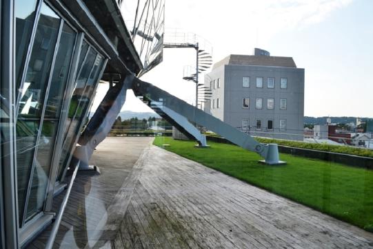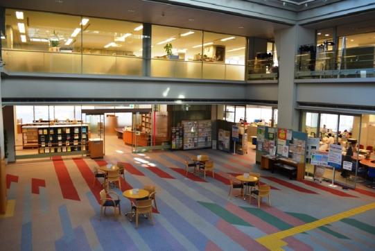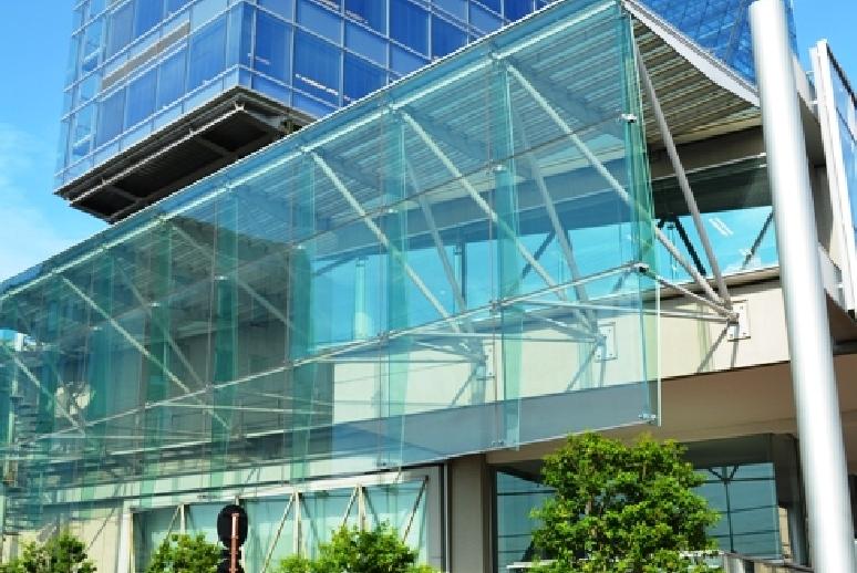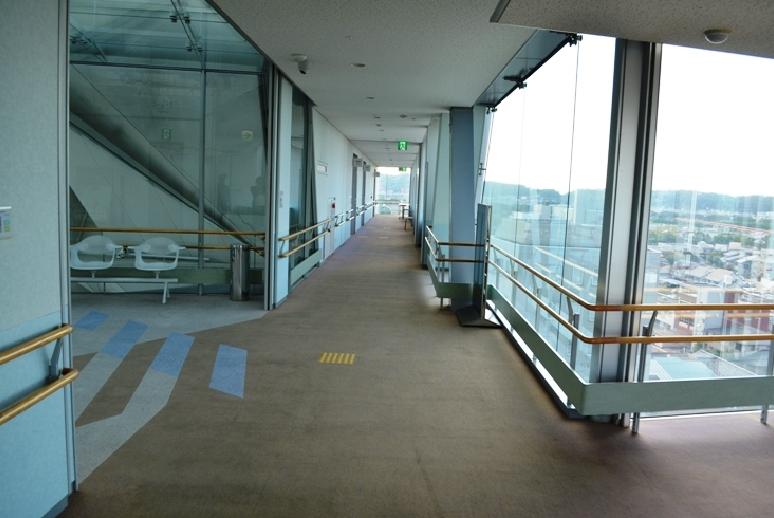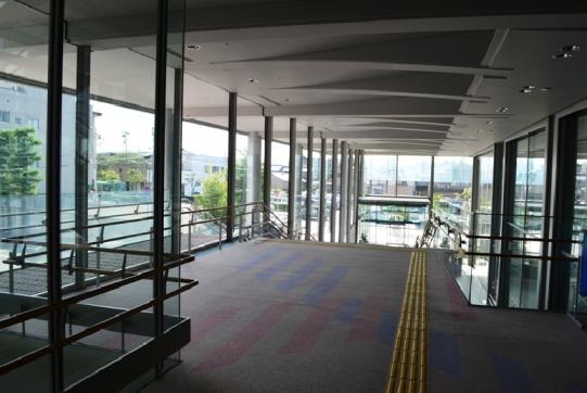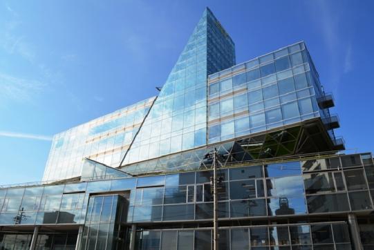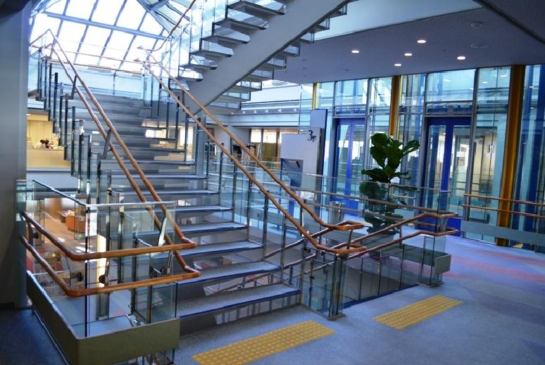 全面ガラス張りの近代的な建物。上の階からは富山市内を見渡すことができ、一望できる。