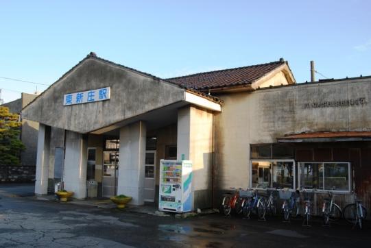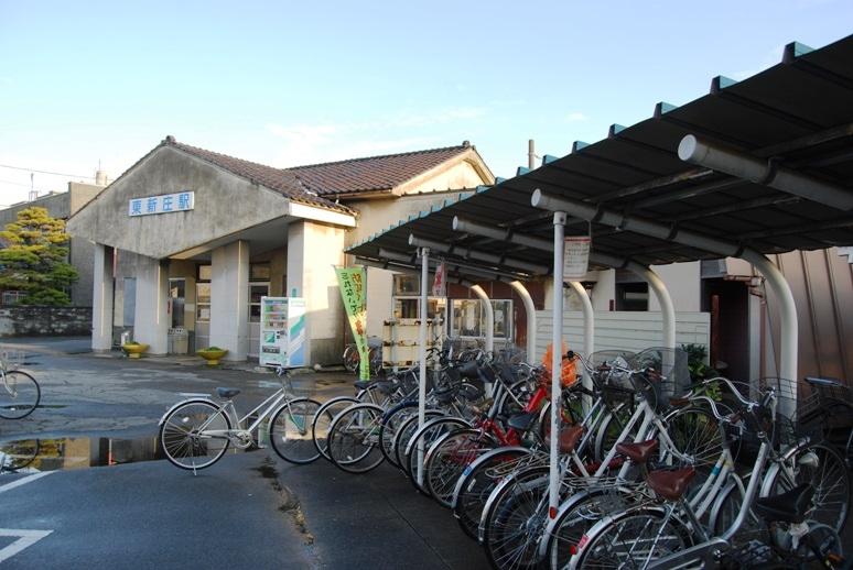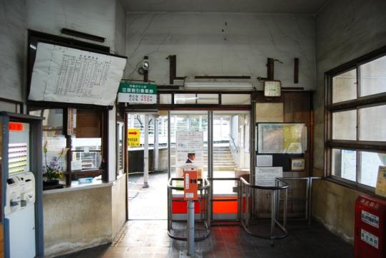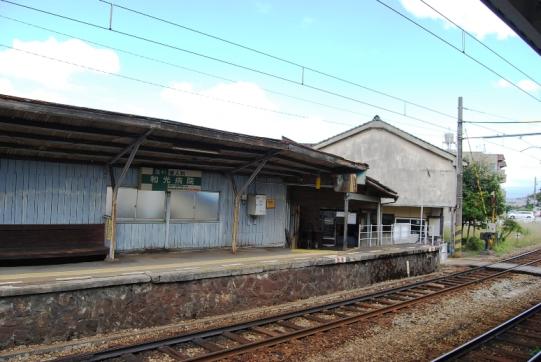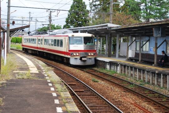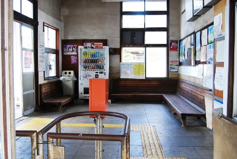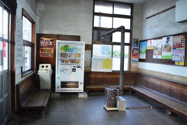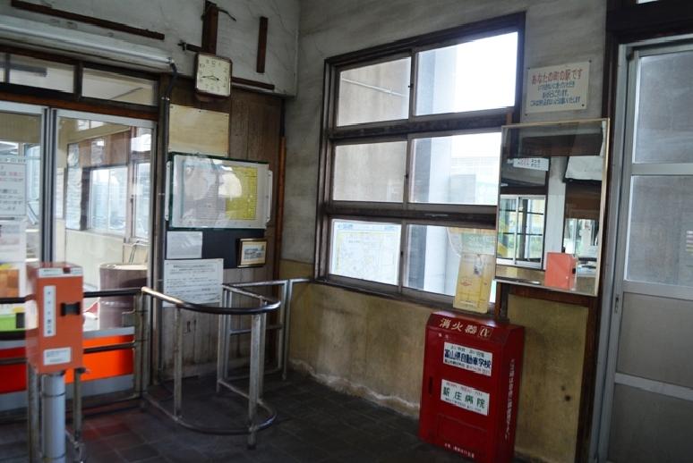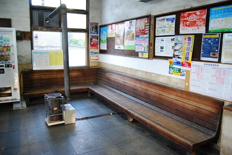 富山地方鉄道本線の駅。駅舎正面のモダンな菱形の意匠が特徴。駅の待合室もレトロ。ホームは、カーブを描いており、列車を撮るのに適している。
