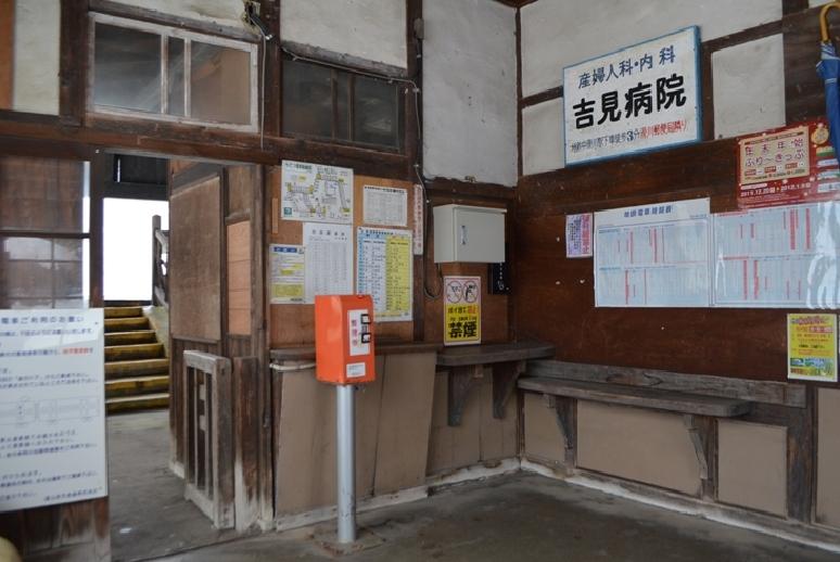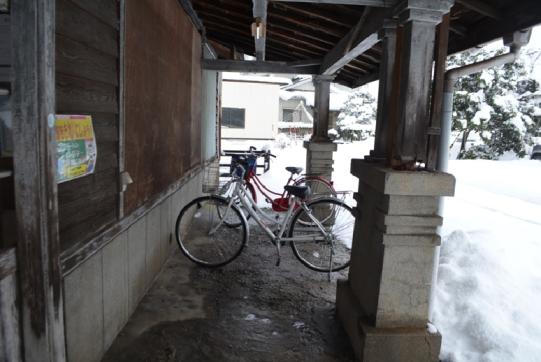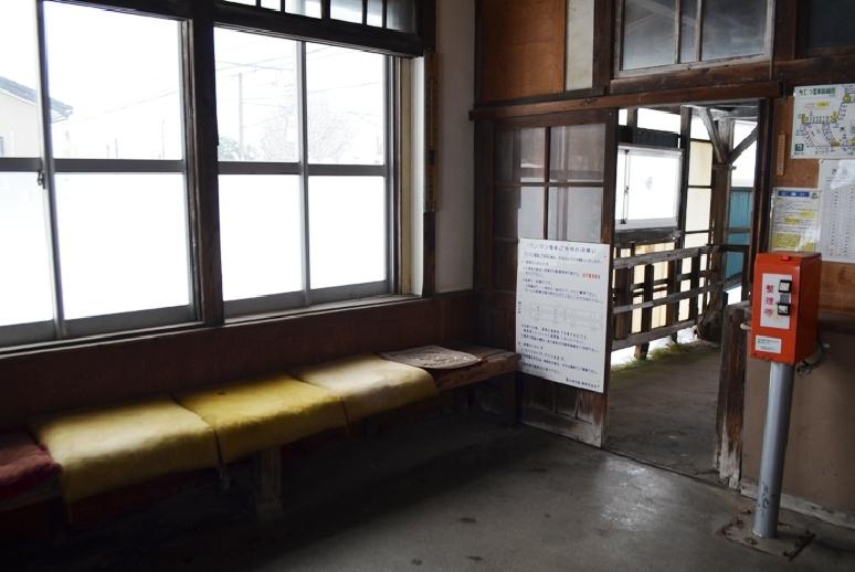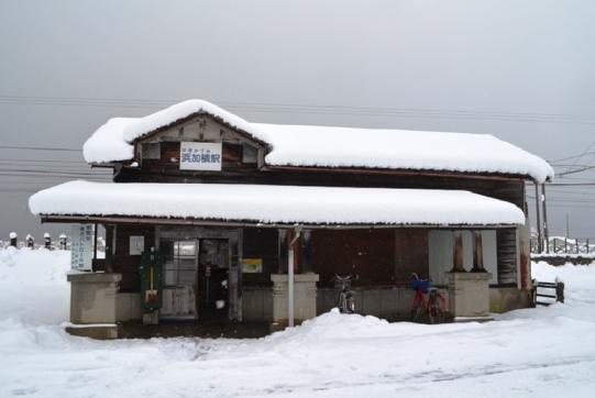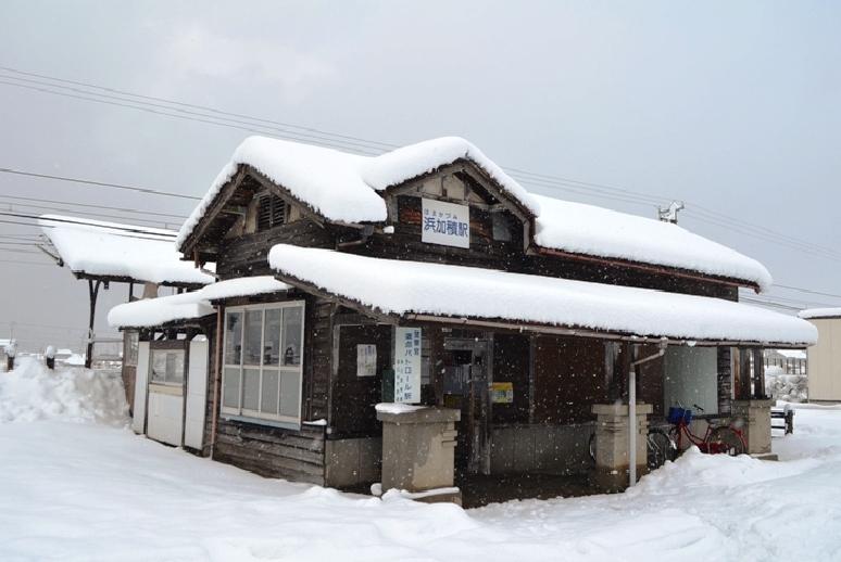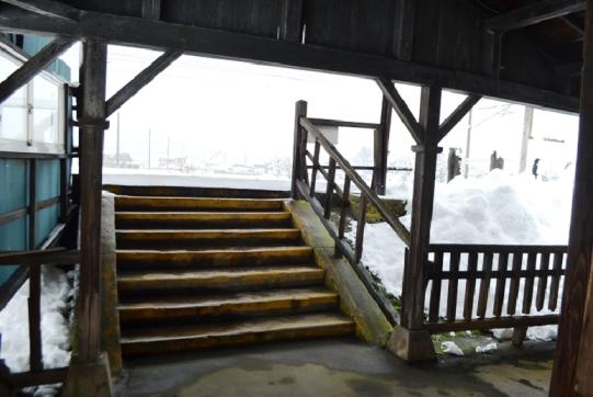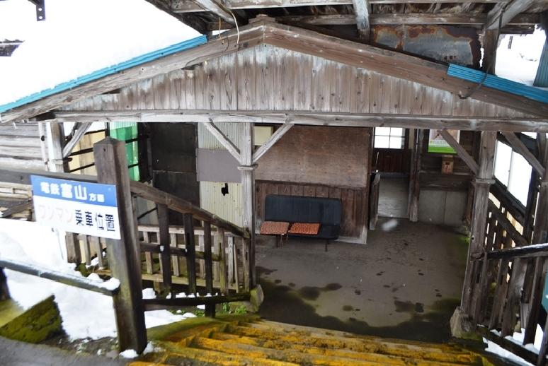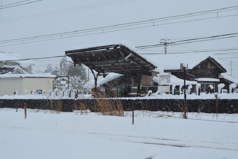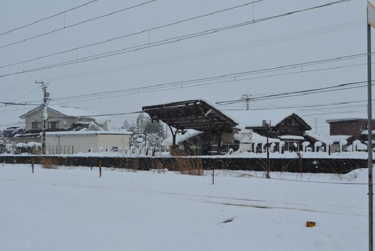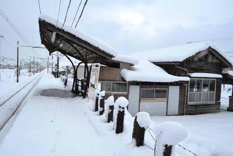 レトロな木造洋風の駅舎。電車はJR北陸本線と並行して走る。抜けがよく、雪の中にポツリと佇む姿は趣がある。