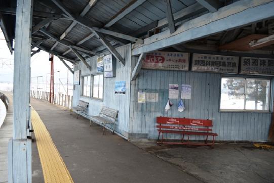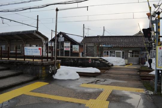 ホームとホームの間に待合室のみの一軒家のようなつくりの建物が建っている。