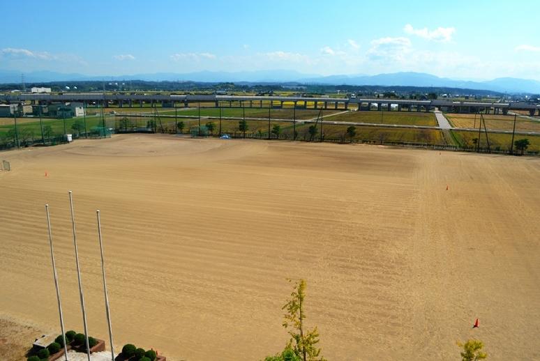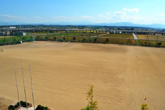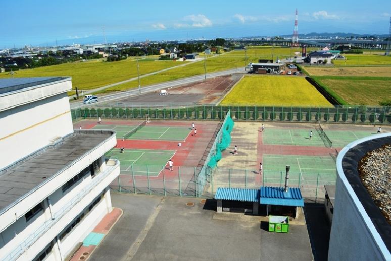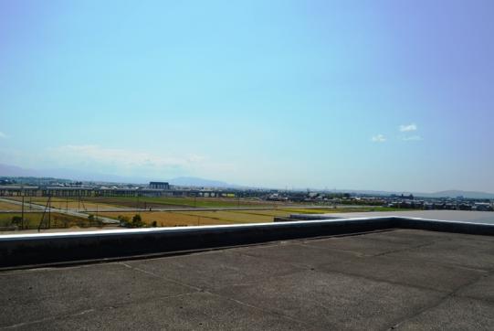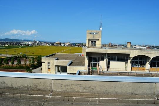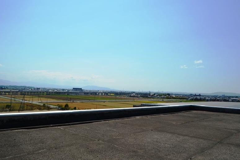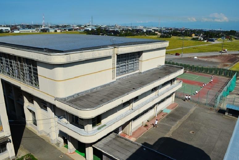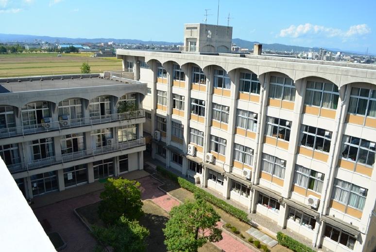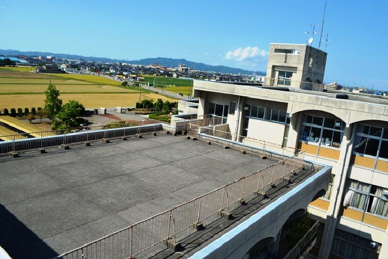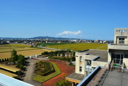田んぼの中に佇む大門高校。広大な敷地に大きな校舎は、抜けもよく屋上からの眺めもいい。
