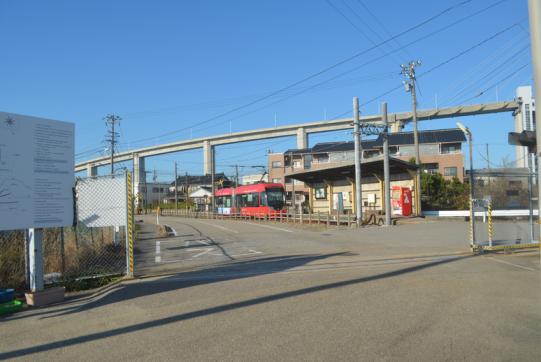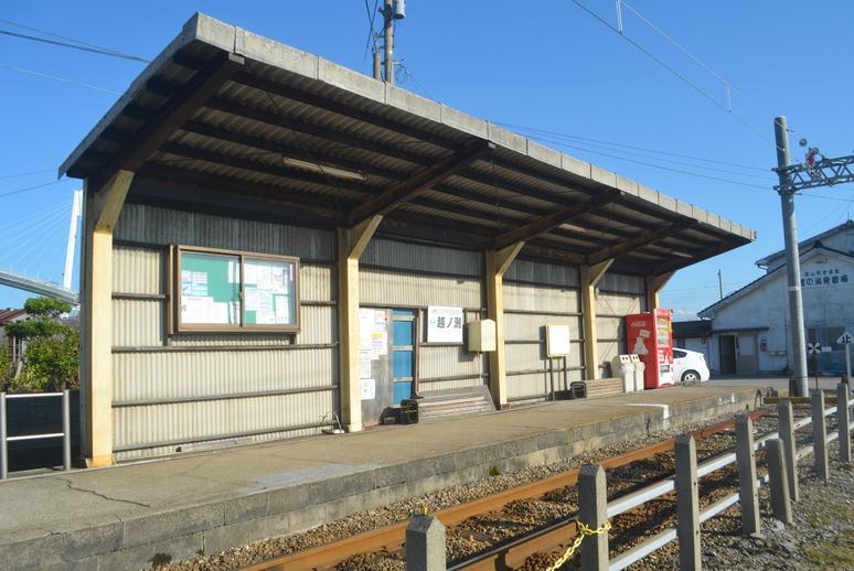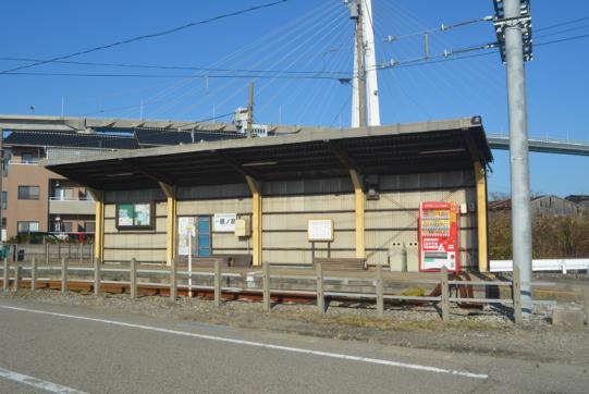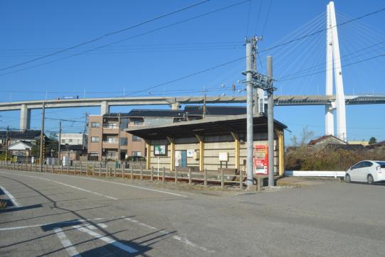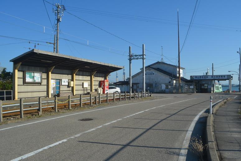 万葉線の終着駅。ホームを降りると、港と乗船場がある。新湊大橋も近く、海が見える駅。
