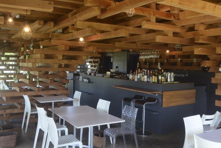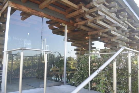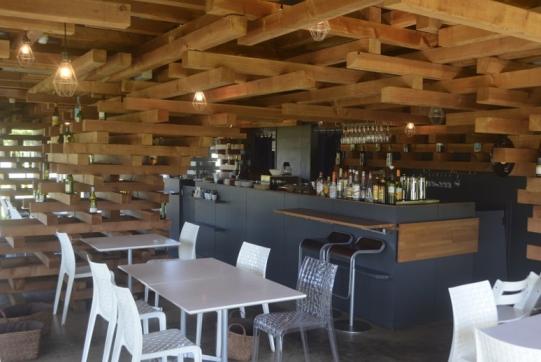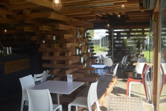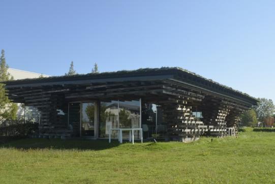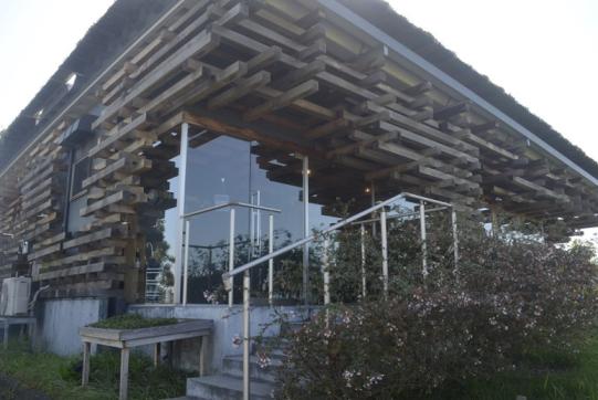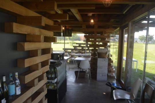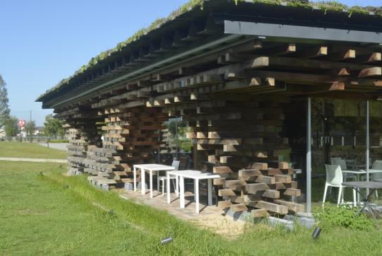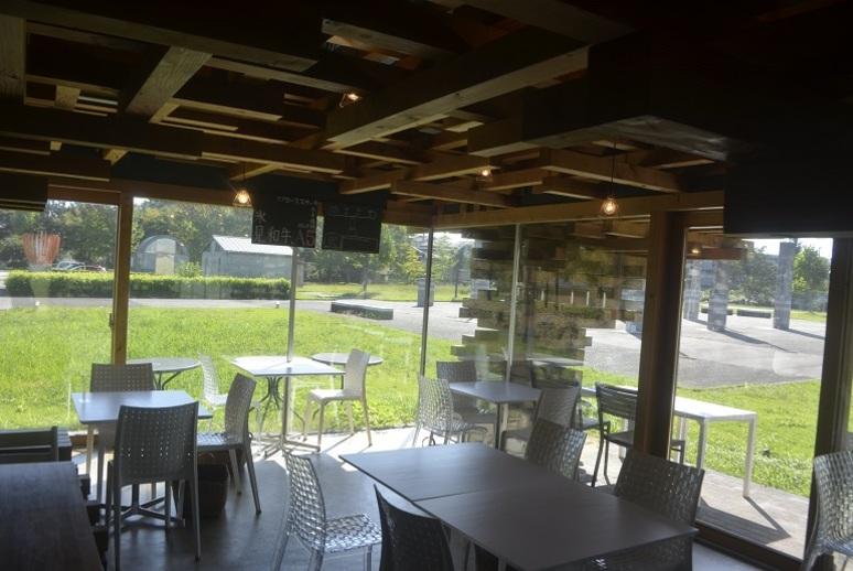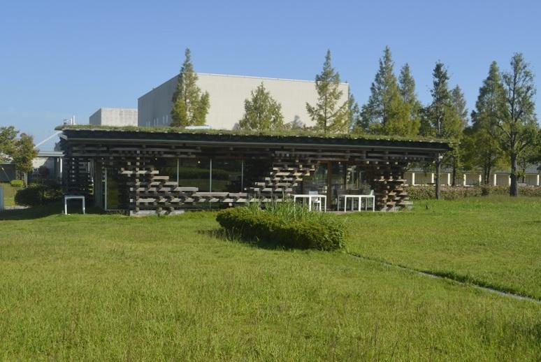 建築家・隈研吾さんによるデザインが独創的なカフェ。富山市舞台芸術パークの鮮やかな芝生の一角にあり、ロケーションもGOOD!木材を積み上げたジェンガのような構造の建物。大きなガラス窓も印象的で、室内には明るい光が差し込む。