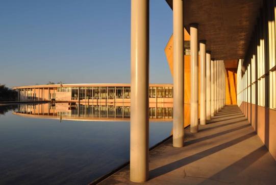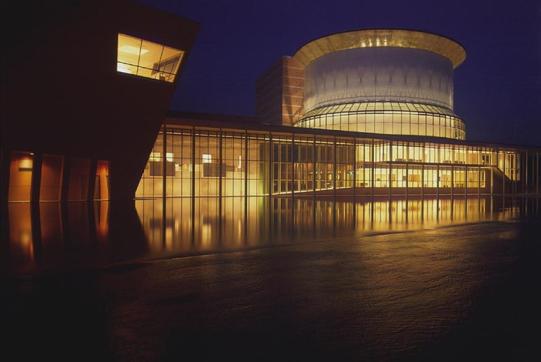 地域文化の創造発信の場として、オリジナリティあふれる様々な企画やイベントが開催されている施設。日本建築学会賞を受賞した建築物としても有名で、劇場や図書館、レストランなどが入っている。バルコニー席が1席ごと、わずかに高さの違うベルリン・フィルハーモニー様式の音響プラン設計であるカーターホールや、35面マルチビジョンや250インチの大スクリーンなどの多機能設備のマルチホール、展望フロアからスロープを降りながら作品を見られる展示室、暖炉のある学習ゾーン、能舞台など、文化発信の場として充実の設備となっている。夜はライトアップもされ、水辺にうつる茶室や劇場の姿はとても美しい。
