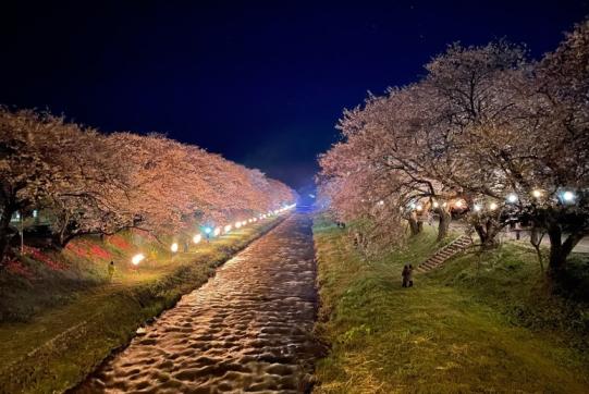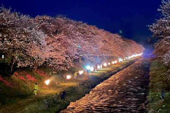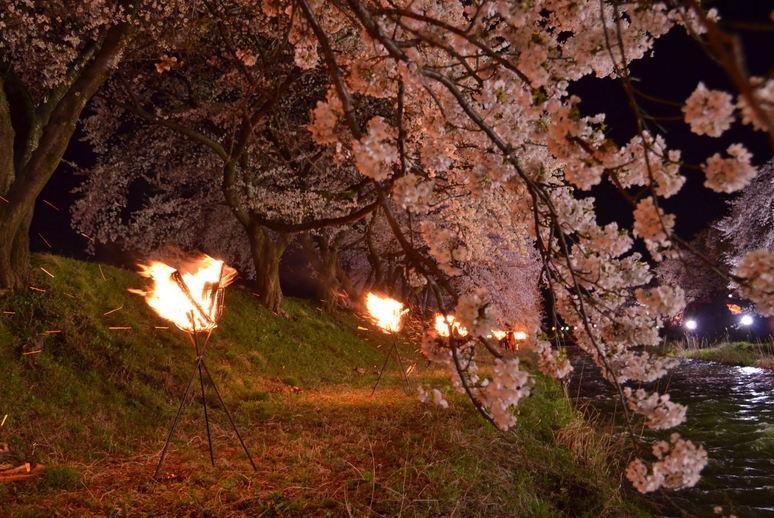期間中の設定日だけに焚かれるかがり火に照らされる夜桜もとても幻想的で、昼と夜で表情の異なる桜が楽しめる。