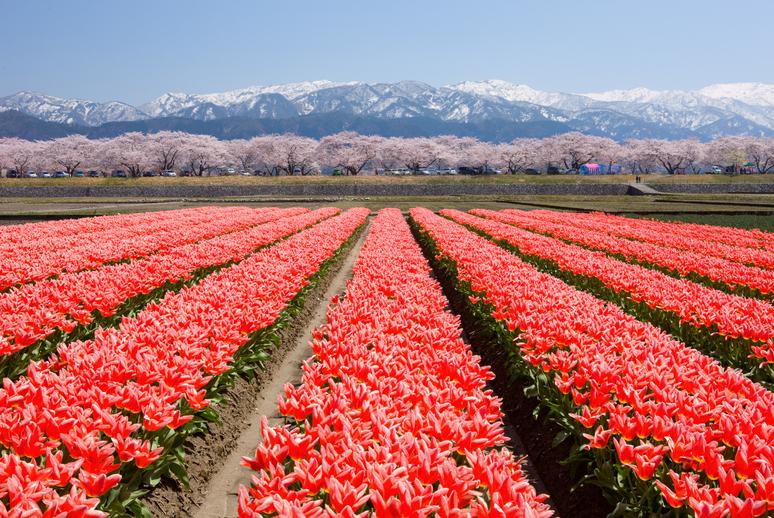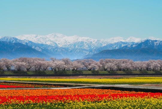 朝日町の舟川べりでは、地元舟川新地区の農家が、桜に合わせて極早生のチューリップと菜の花を栽培しており、雪を抱く白馬岳・朝日岳の北アルプスを背景に、桜並木とチューリップ、菜の花が奏でる四重奏を楽しめる。