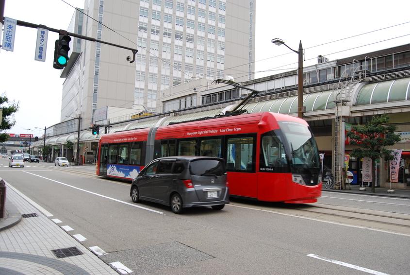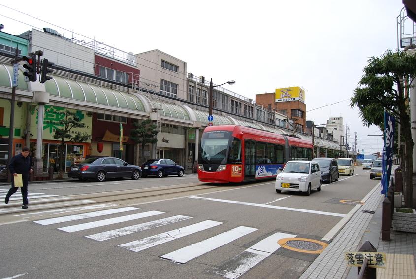 高岡駅近くの街並み。路面電車”万葉線”の線路と並び、商店街が軒を連ねる。劇場アニメ映画「君の膵臓を食べたい」(2018)では、僕(主人公)が、万葉線に乗って桜良との待ち合わせ場所に向かうシーンに街並みが登場する。