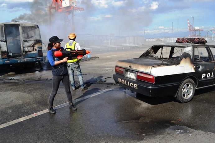 パトカー、護送車の爆破直後、強力な水鉄砲にに消火活動を行う私。