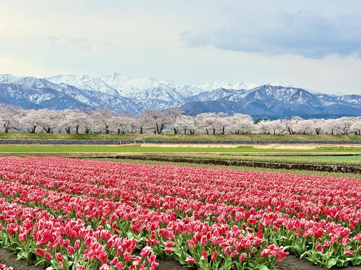 雪の残る美しい北アルプスの山々を背景に、舟川べりの桜並木、チューリップ、菜の花が奏でる美しい四重奏を楽しむことができる、朝日町の春の風物詩です。