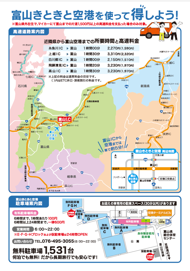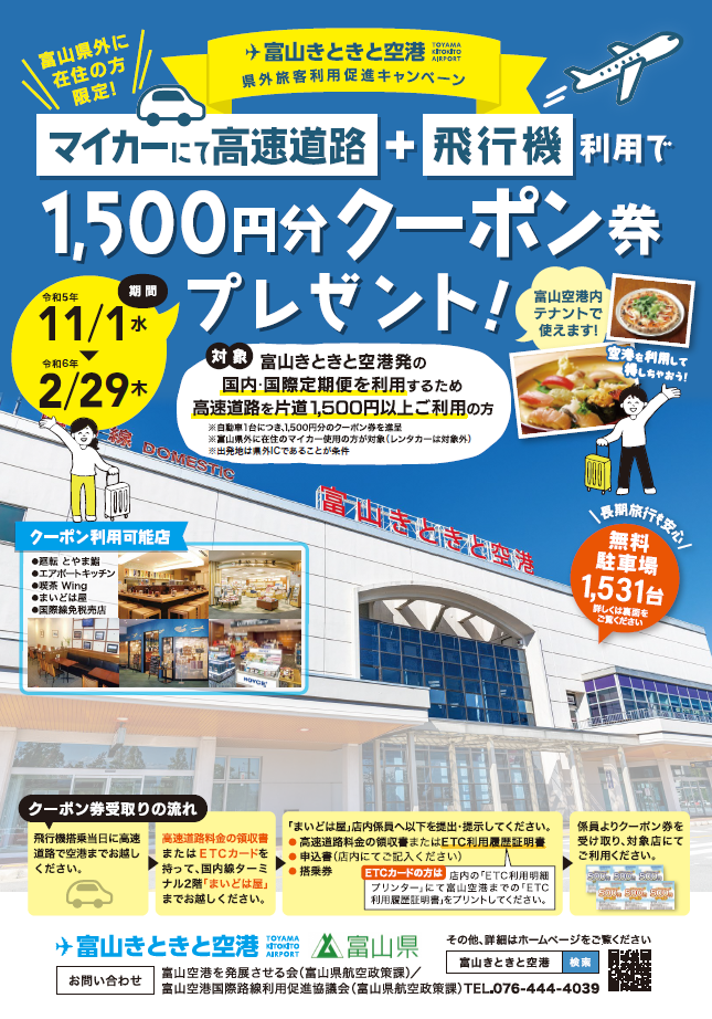 富山県外から富山空港までマイカーで高速道路を利用して富山空港の定期便を利用する方にもれなく空港内店舗で使える1,500円分のクーポン券をプレゼント!