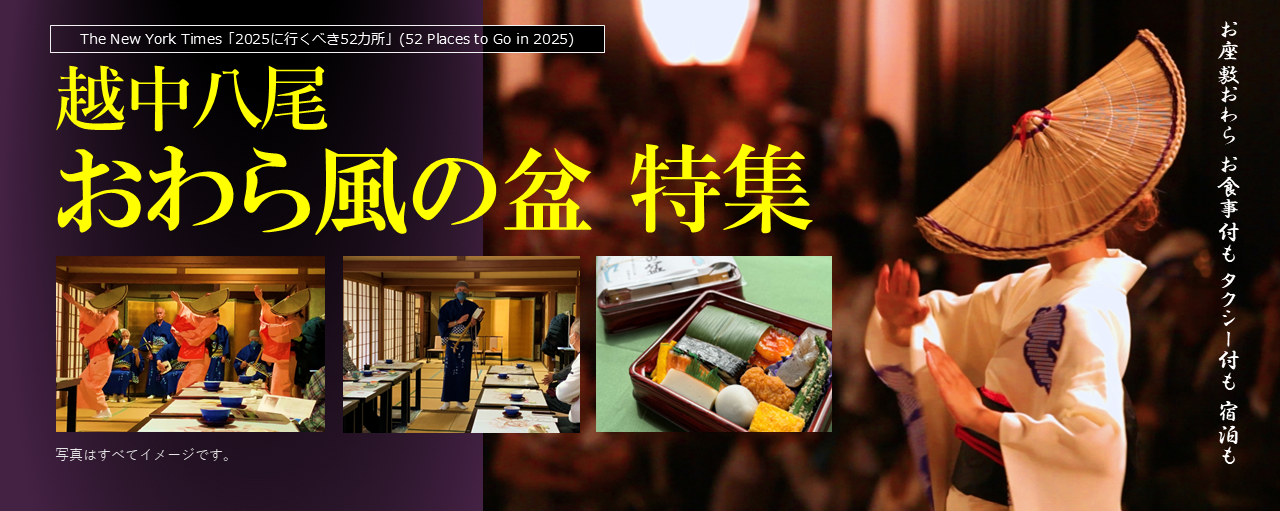 上記プランを含む、9月1日(月)または2日(火)【東京発着】ご宿泊ホテル~八尾町までタクシー送迎付きのツアーはこちらで好評発売中です。ご予約はお早めに!