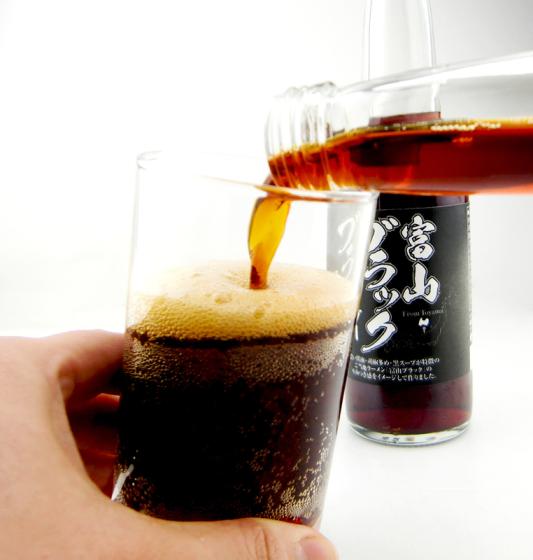 醤油ベースの真っ黒いスープにピリリときいた胡椒の辛味が特徴の富山のご当地ラーメン、『富山ブラック』をイメージして作られたオリジナル地サイダー。色はラーメンのスープを思わせる黒、味は醤油の風味に加え、胡椒のスパイシーなフレーバーをプラスした独特のテイストに仕上がっています。スパイシーな飲み口と、サイダーの甘み、炭酸の爽快さが絶妙にマッチし、「一度飲むとやみつきになる」という声も。サイダーの醤油・胡椒のフレーバーはアルコールとも相性が良く、ビールと割って黒割りにしたり、ウィスキー・焼酎と合わせてハイボールにして飲むのもオススメ。おみやげに強いインパクトのあるものや今までにない斬新なものをお探しの人はぜひ!