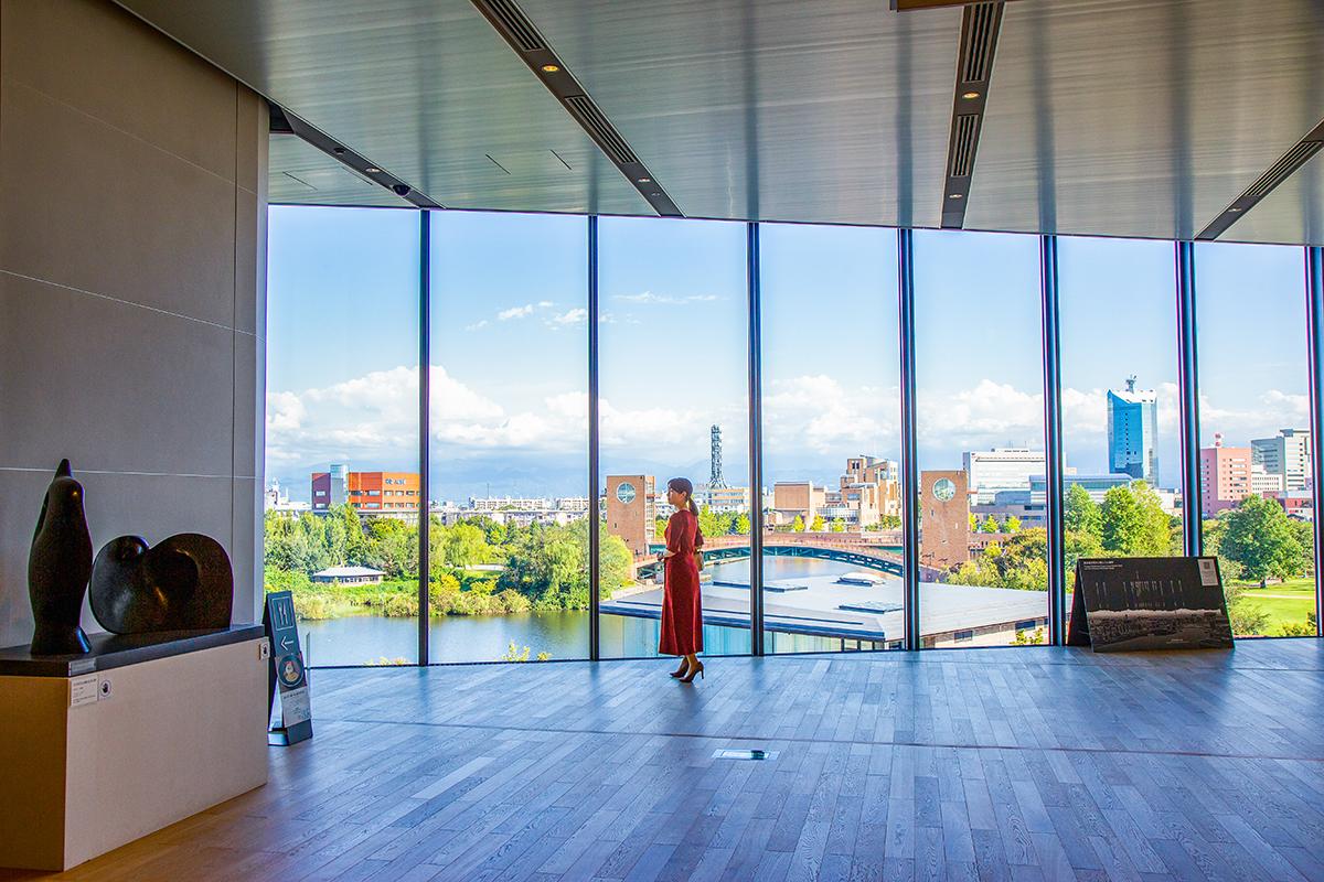 セントラム(路面電車)に乗って富山駅へ。そこから徒歩で富岩運河環水公園の敷地内に立つ「富山県美術館」を目指します。アート&デザインを謳う美術館として2017年に開館し、世界的コレクションを新しい切り口やテーマ、見せ方で紹介しています。富山の美しい風景を取り込んだ建築設計は内藤廣氏。「オノマトペの屋上」と名づけられた屋上庭園にもぜひ足を運んでみて。オノマトペから考えられた遊具の数々が、大人の遊びごころをくすぐります。