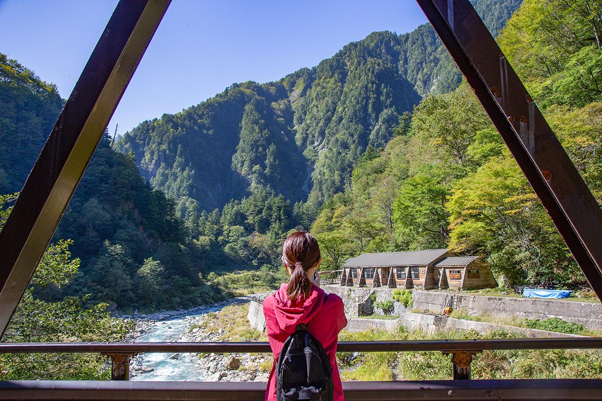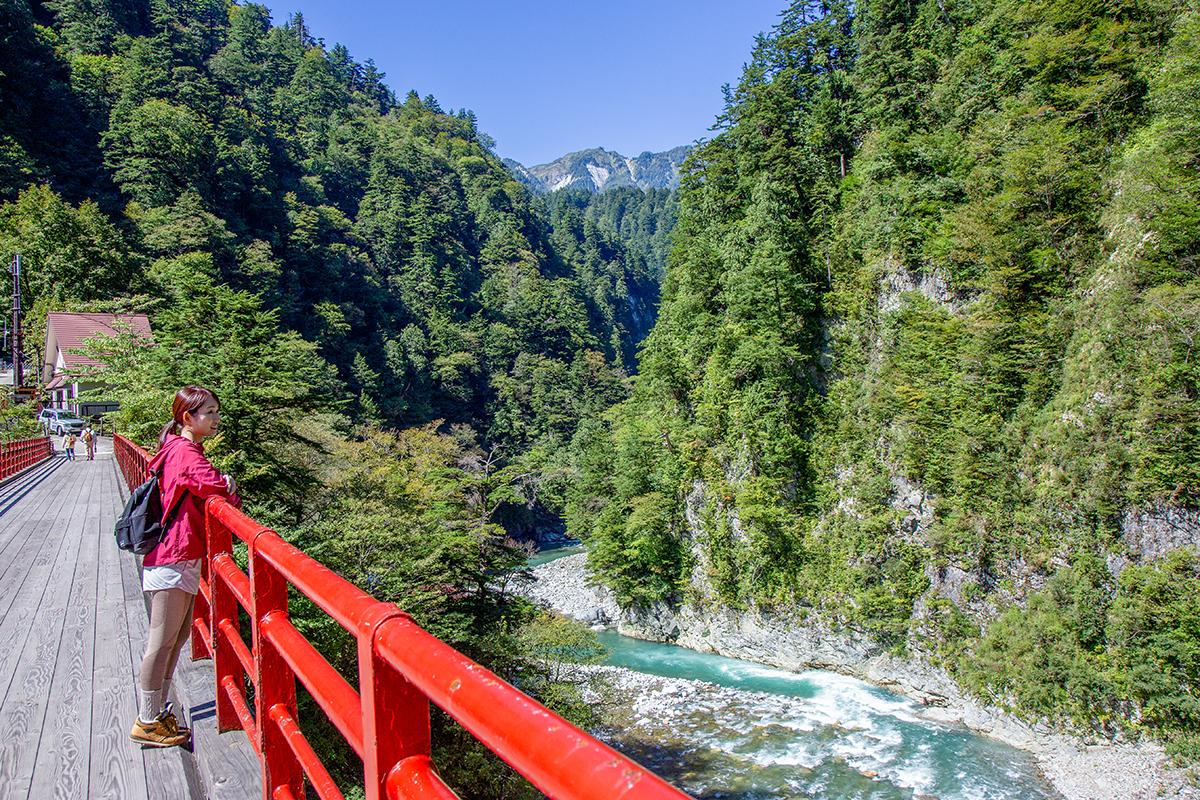 約1時間20分で、トロッコ電車の終点・欅平駅に到着。大きく背伸びをして、周辺を散策しましょう。黒部川の本流にかかる「奥鐘橋」は、豊かな緑に朱色が映えるビュースポットです。黒部川を間近に見る河原展望台には足湯があり、大自然に囲まれてリラックスできます。