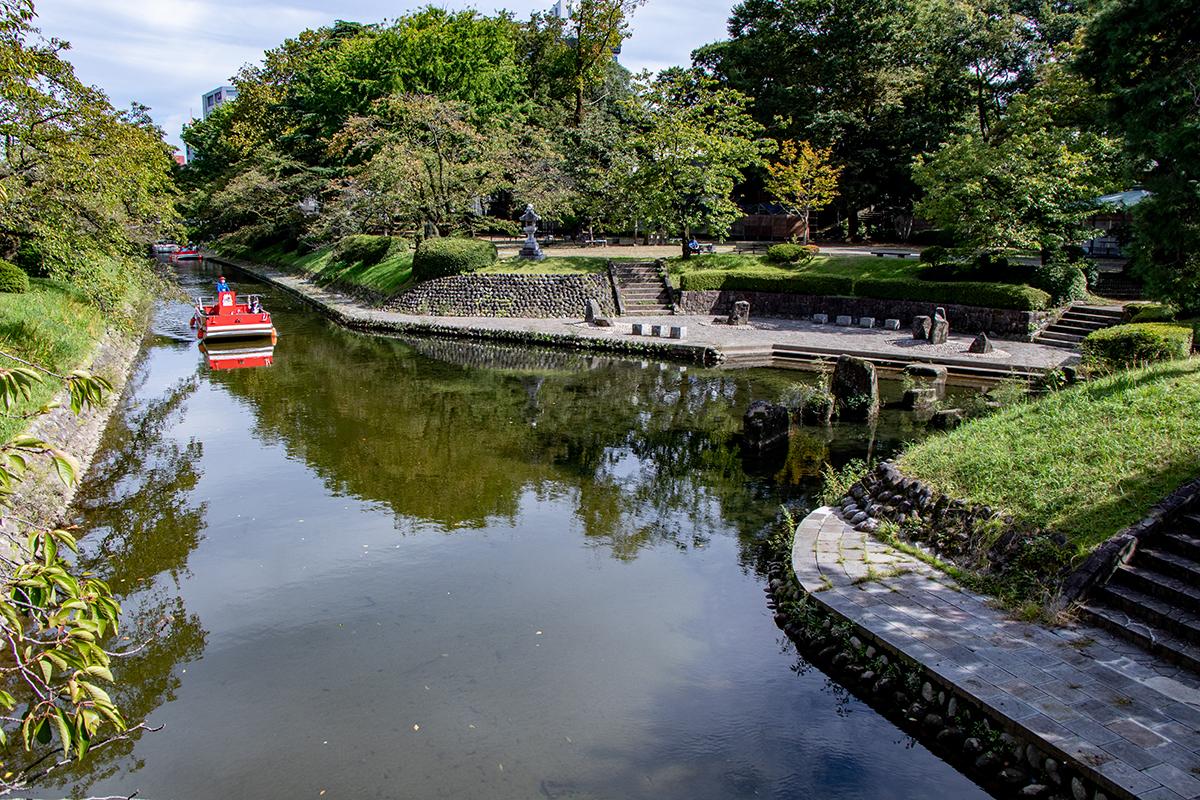 「富山城址公園」は、その名の通り富山城の城跡を整備した公園で、中心市街地のオアシス的空間です。公園に入る前に、お堀の水面に映る天守閣の雄姿を写真に収めておきましょう。