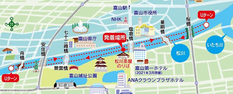 その松川を運航するのが「松川遊覧船」です。塩倉橋たもとの松川茶屋を出発し、上流の舟橋と下流のいたち川との合流点の間を約30分かけて往復します。富山の歴史を語る船長の富山弁も心地よく、のんびりと船旅を楽しめます。川沿いの桜並木は「日本の桜名所100選」に選ばれており、春は水面からの花見が人気です。