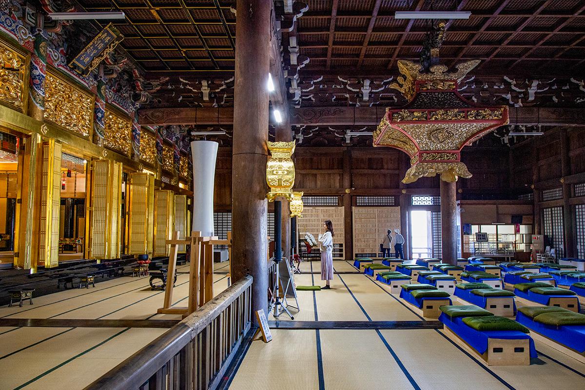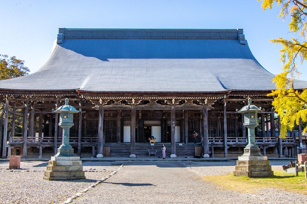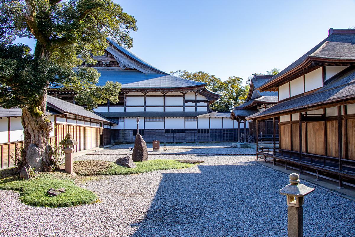 このコースの目玉のひとつ、勝興寺を訪れます。勝興寺は、越中一向一揆の拠点となったことでも知られる浄土真宗本願寺派の寺院です。もともと、江戸時代に建てられた12棟の建造物が重要文化財に指定されており、平成の大修理を経て、12棟のうち「本堂」と「大広間及び式台」の2棟が国宝に指定されました。江戸時代の境内景観をほぼ完璧に残す、全国を見渡しても稀少価値の高いスポットです。