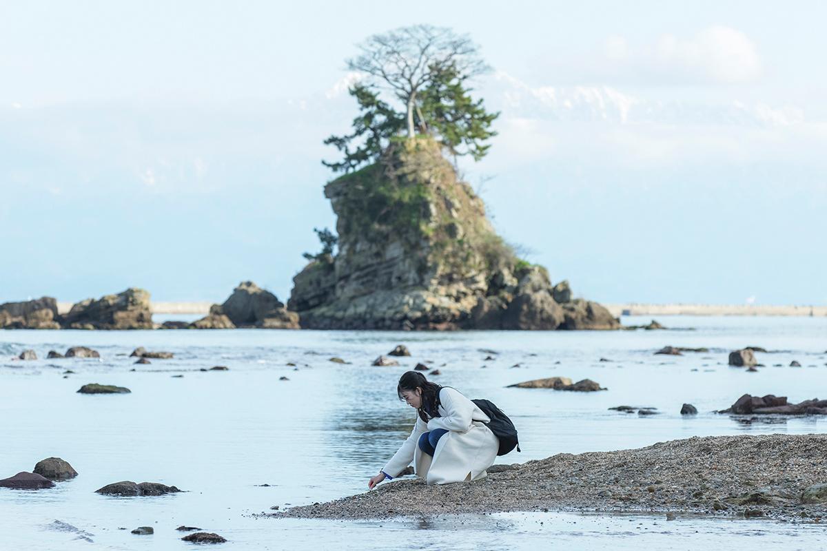 再び伏木駅からJR氷見線に乗り込むと、やがて右の車窓いっぱいに富山湾の景観が広がります。青い海と白い波の向こうに立山連峰を望む雨晴海岸へ。雨晴駅で下車し、海岸を目指します。