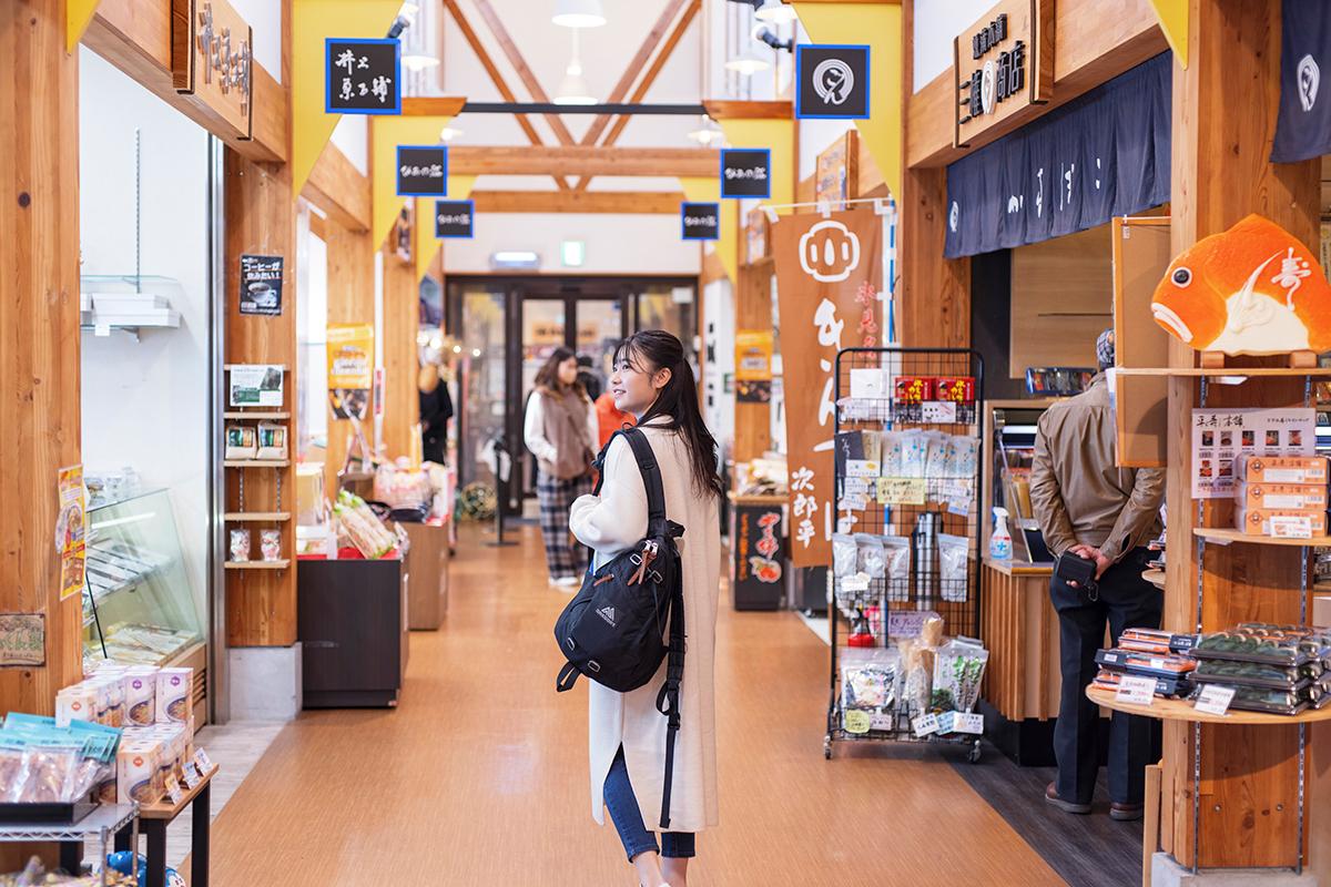 氷見の一番の魅力といえば、富山湾で水揚げされる新鮮な海の幸。氷見の魚介が一堂に集まる観光スポットが、漁港にも近い「ひみ番屋街」です。寿司や海鮮グルメはもちろん、氷見うどん、氷見牛などの地元名物を味わえます。源泉掛け流しの足湯があるので、富山湾上に浮かぶようにそびえる立山連峰を眺めながら一日の旅の疲れをほぐしましょう。