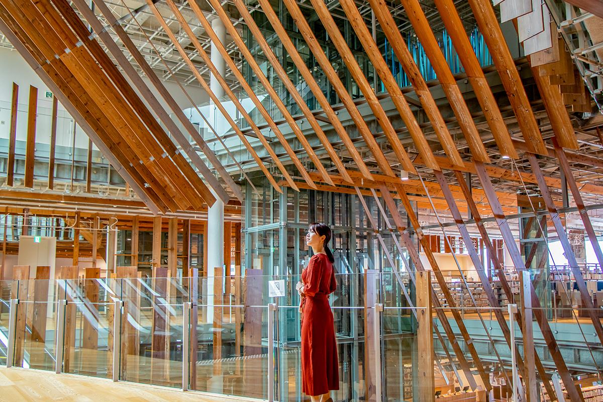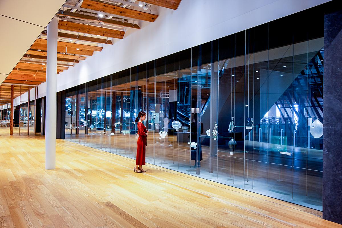 次の目的地は、富山の中心市街地にある「富山市ガラス美術館」です。光を反射してキラキラ輝くファサードが目印です。設計を手がけたのは世界的建築家の隈研吾氏。足を踏み入れると、明るく開放感あふれる吹き抜けに圧倒されます。