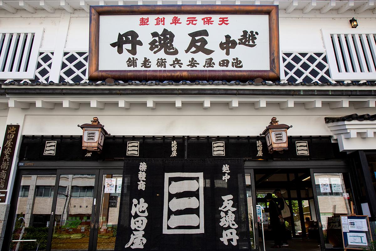 旅の終わりは伝統的な建築&伝統産業でしめくくりましょう。「池田屋安兵衛商店」は戦後まもなく薬の製造を始め、江戸時代に一世を風靡した「越中反魂丹」を現代に通用する和漢薬として復活させました。現在も日本の伝統薬を中心に、和漢薬の世界を追求しています。白壁土蔵造りが目を引く店舗は、中心市街地で最も古い木造建築のひとつ。フォトスポットとしても人気を集めています。