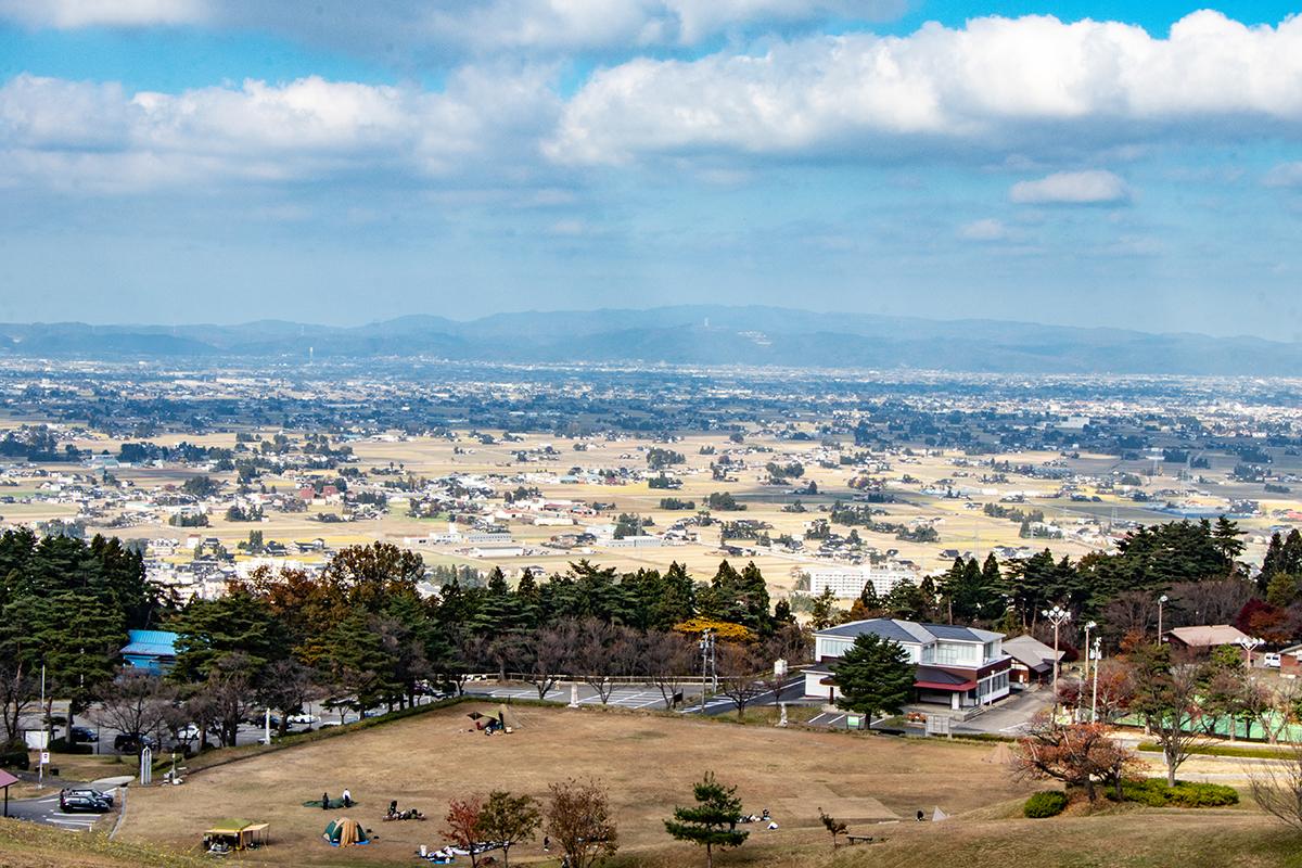 公園内の展望広場に立てば、一面の水田の中に家々が点在する美しい散居村風景を一望できます。