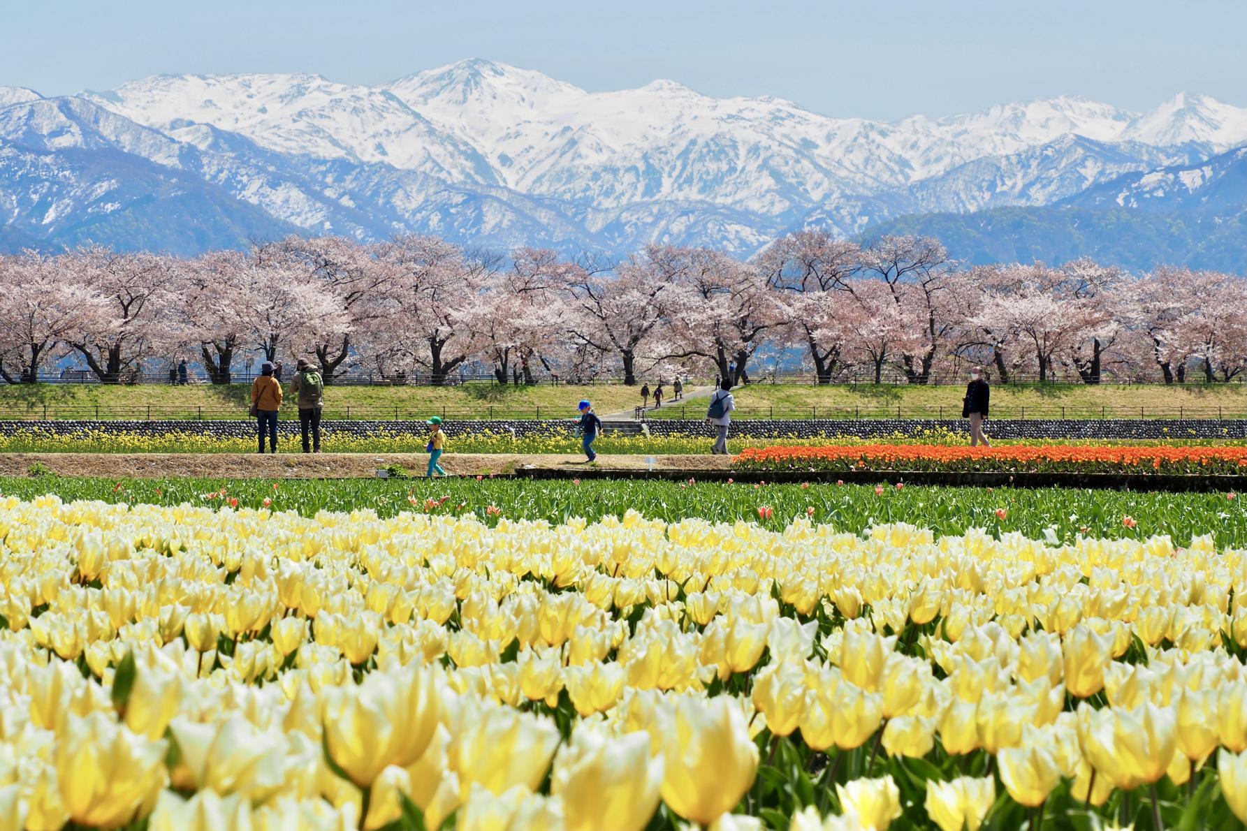 朝日町の舟川べりで見られる春の風物詩。残雪の朝日岳に、川の両岸に植えられた約280本もの桜並木、そこにチューリップと菜の花の畑が広がり、奇跡の光景が生まれます。開催期間はお得な「春の四重奏きっぷ」も販売。