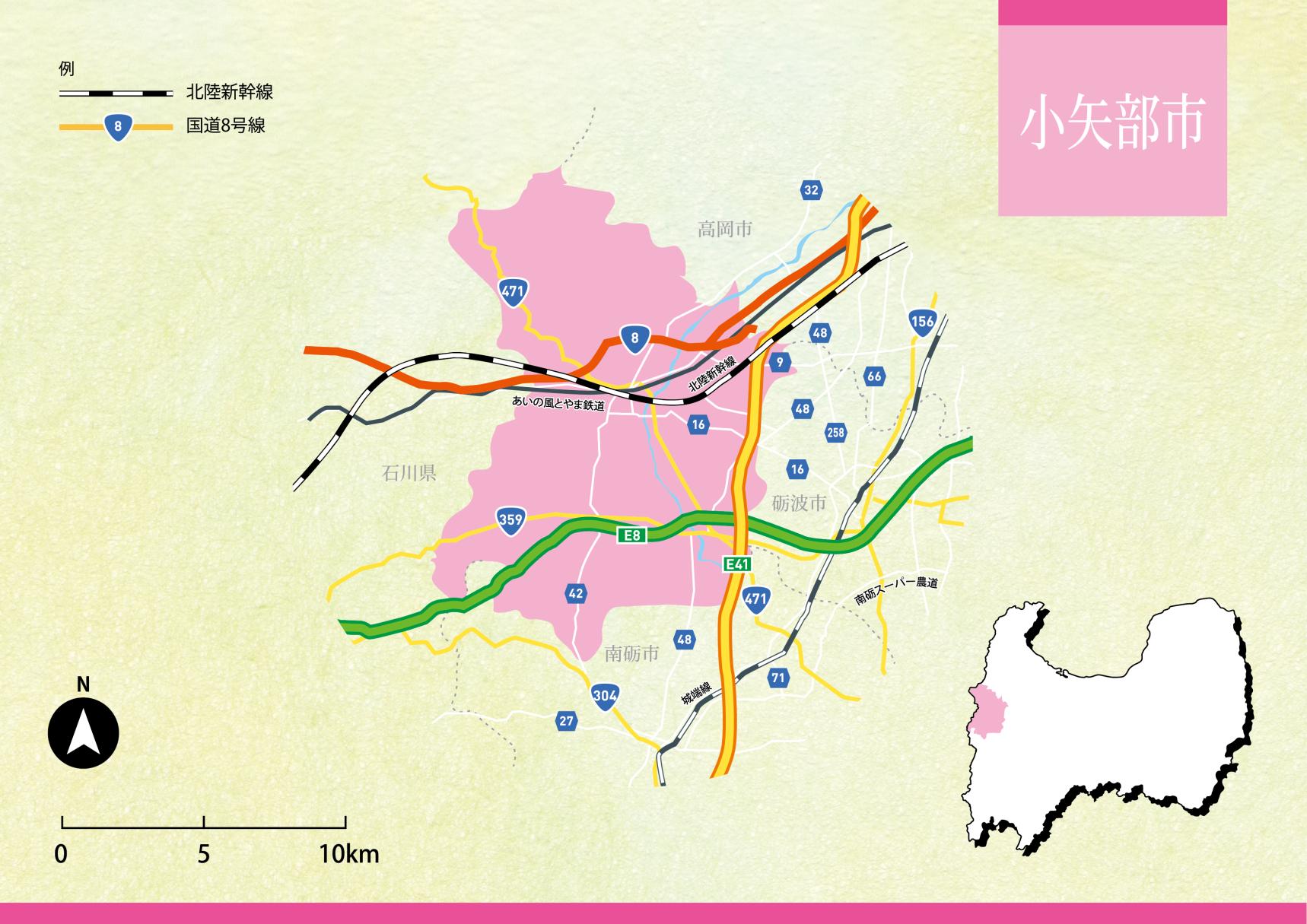 一宮JCT→小矢部・砺波JCT→小矢部東I.C→小矢部市街地 (約2時間40分)