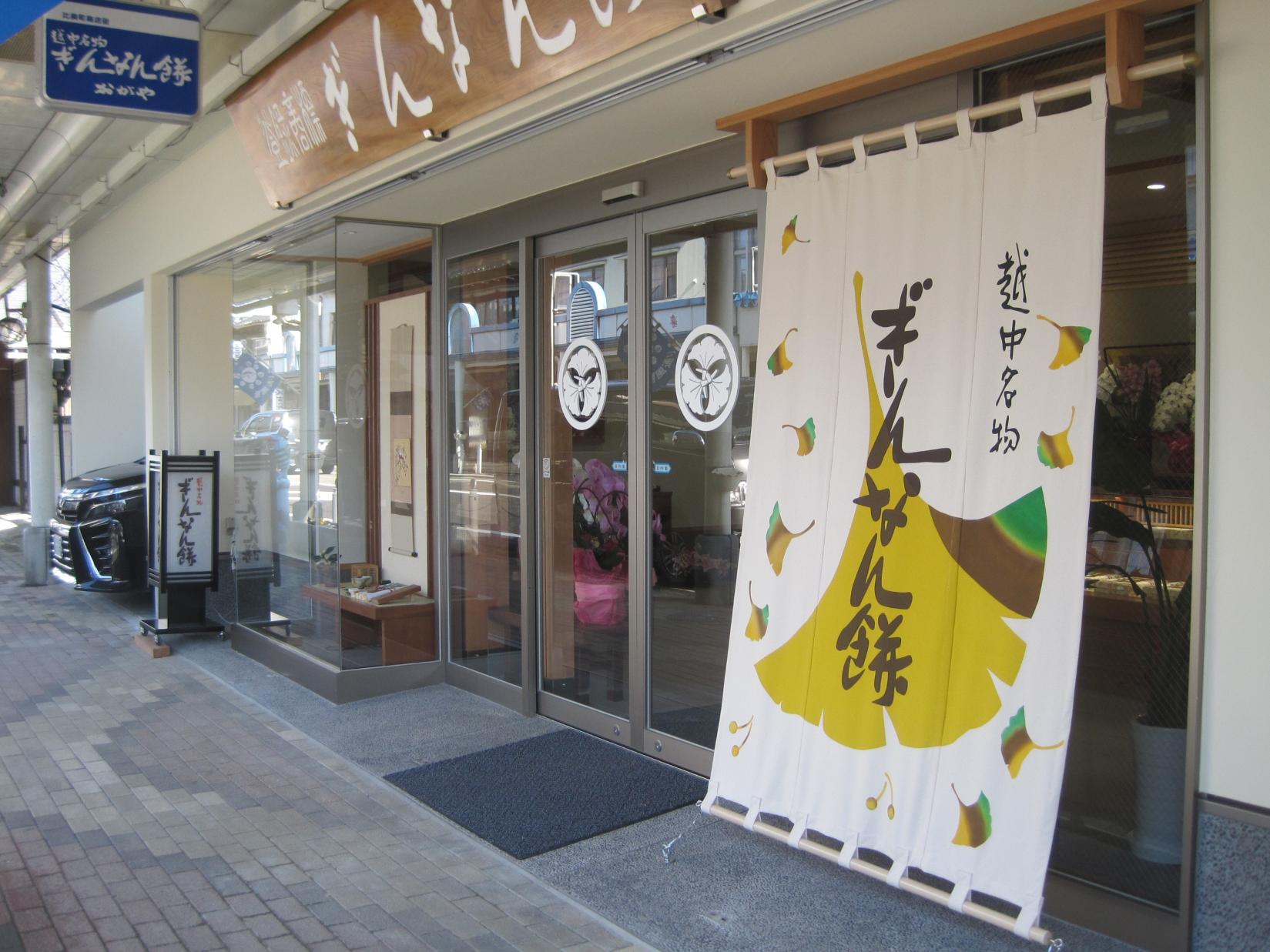 ぎんなん餅本舗 おがや本店明治5年創業の和菓子店。昔ながらの製法をまもったぎんなん餅は、ほのかな甘みとぎんなんの香りが口に広がる上品なお味。