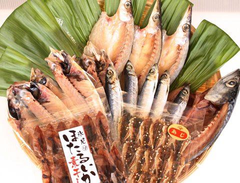 堀与漁師町として栄えてきた氷見の美味しい干物を中心に、厳選した国内外の海産物が並ぶ。