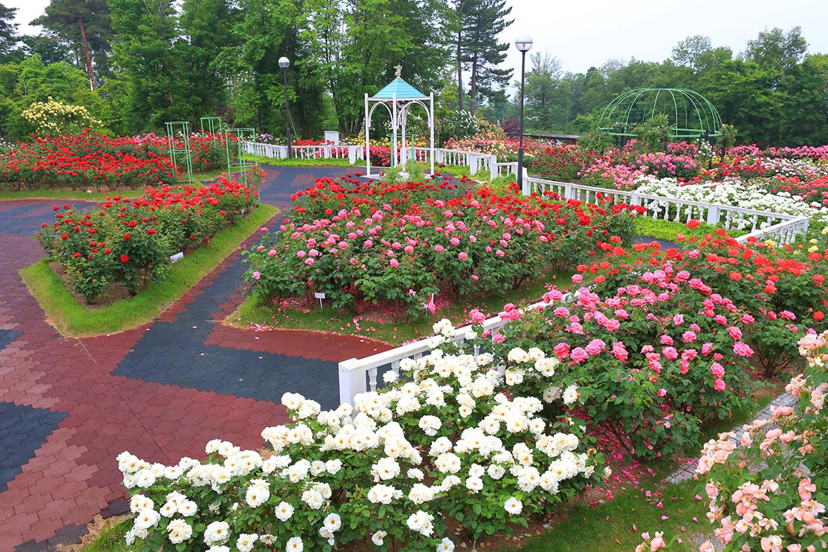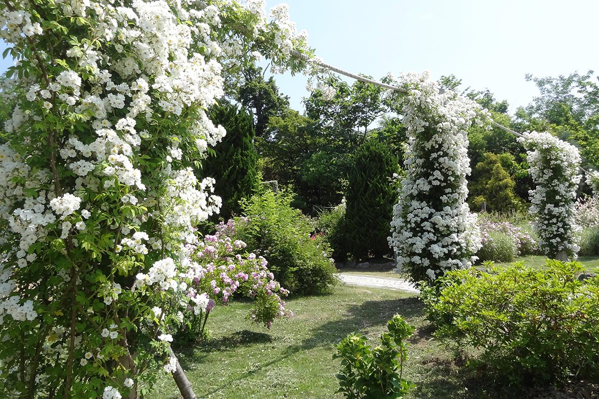 ひみ番屋街を後にして、海沿いの爽快なドライブを楽しんだ後、標高100mの丘の上に建つ広大な西洋風の庭園に到着。里山に育つ赤松やどんぐりの木などの樹木と、春のチューリップ、初夏のバラなど季節ごとにデザインされた植物の調和が見事です。
