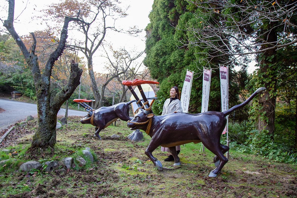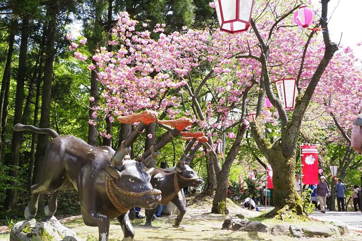 今から約840年前の平安時代末期、源氏の武将 木曾義仲の軍勢と、平維盛を総大将とする平家の大軍が、石川と富山の県境に位置する、この倶利伽羅峠において、激しい戦いを繰り広げました。義仲が牛の角に松明をつけて突進させる「火牛の計」で平家軍を打ち破ったエピソードが有名です。平家軍が本陣を置いていた場所のそばには、源平供養塔や火牛のモニュメントが建っています。倶利伽羅峠一帯は八重桜の名所で、春には約6000本の八重桜が咲き誇ります。