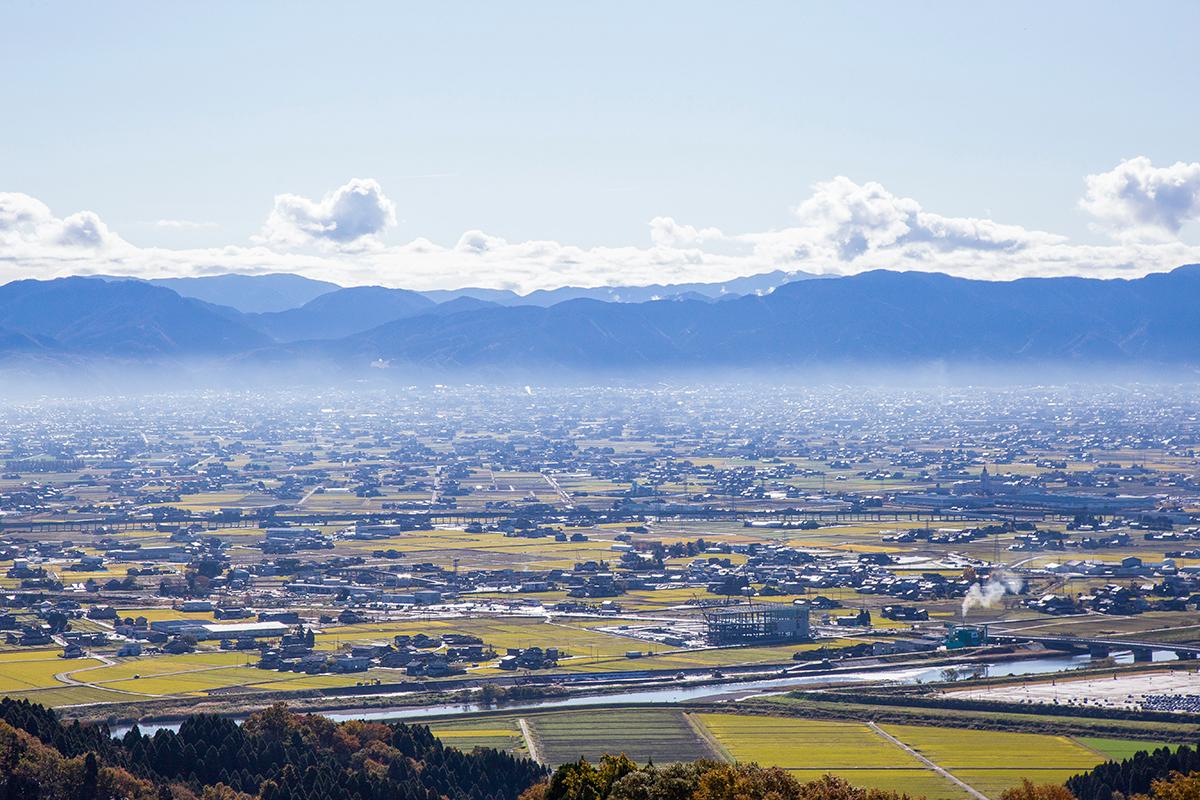 水のある風景に心が潤ったら、次は稲葉山へ向かいます。 標高346mの稲葉山は中腹から山頂にかけて牧場になっており、頂上を目指して車で上っていくと、牛たちがのんびりと草を食んでいる風景が見られます。頂上の展望台からは、一面の水田の中に家々が点在する砺波平野の散居村風景を一望できます。また、土日祝には山頂にある稲葉山カフェレストランで、地元食材をふんだんに使ったメニューが楽しめます。ブランド牛「稲葉メルヘン牛」を100%使用したハンバーグは絶品です。