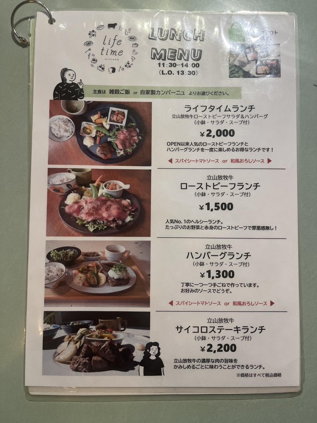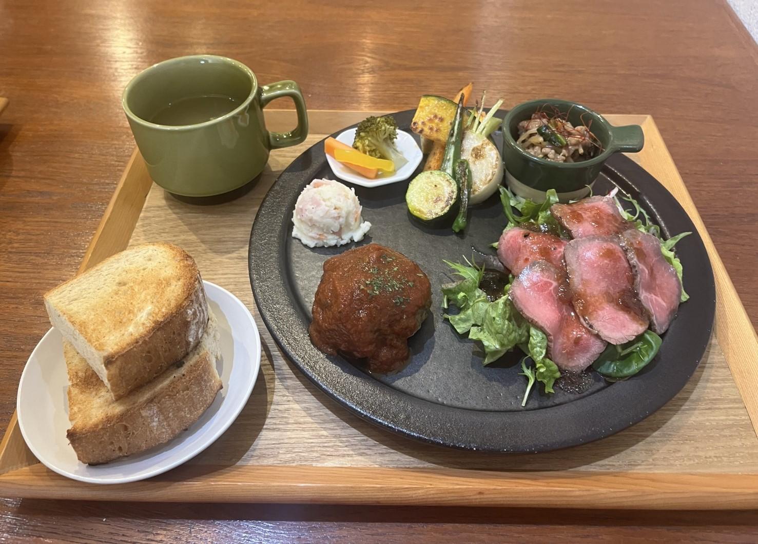 メニューから「ライフタイムランチ」と「ライフタイムステーキランチ」をそれぞれ注文しました。ライフタイムランチは、ローストビーフとハンバーグが一度に楽しめます。一つの皿に赤身鮮やかなローストビーフに手ごねハンバーグ、カボチャやカブ、ズッキーニといった焼き野菜、ポテトサラダに生野菜、ピクルス、肉の小鉢が盛られています。それにスープ、自家製カンパーニュまたは雑穀米が付きます。写真をつい撮ってしまうほど色合いが良く、見ているだけでウキウキします。ローストビーフは肉のしっかりとした赤身の味と歯ごたえがたまりません。ハンバーグも肉肉しい食感とソースが合わさり、絶妙な味わいです。