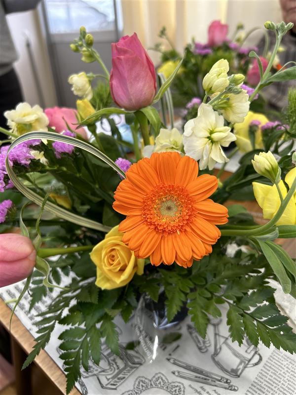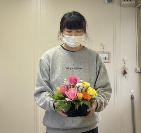 作品を勤務先の来店カウンターに飾ってみると、アレンジメントがいつもの風景に彩りと華やかさを与え、明るい雰囲気に様変わり。日常生活を生き生きとさせる花の魅力に改めて気付いた瞬間でした。