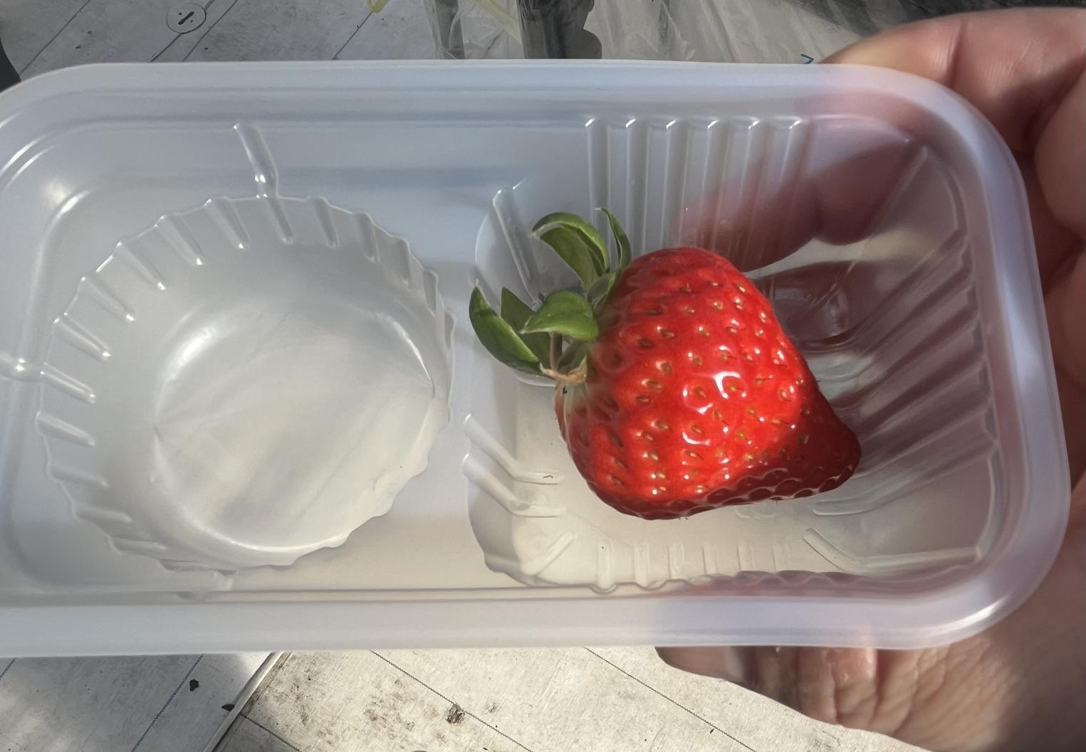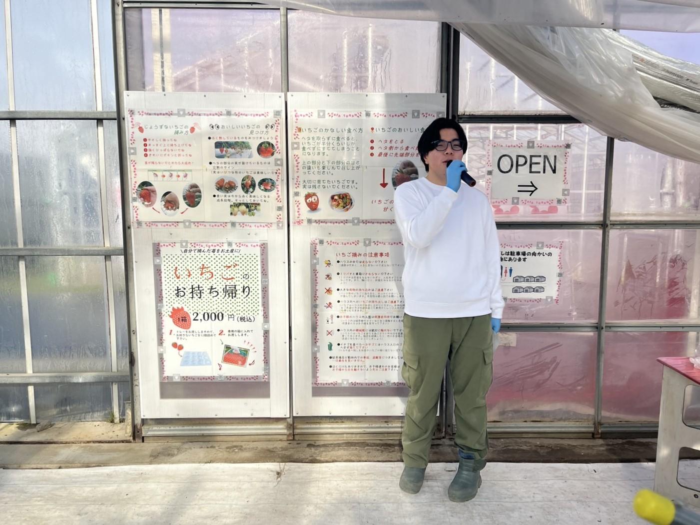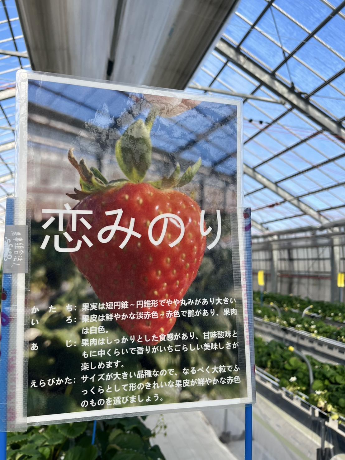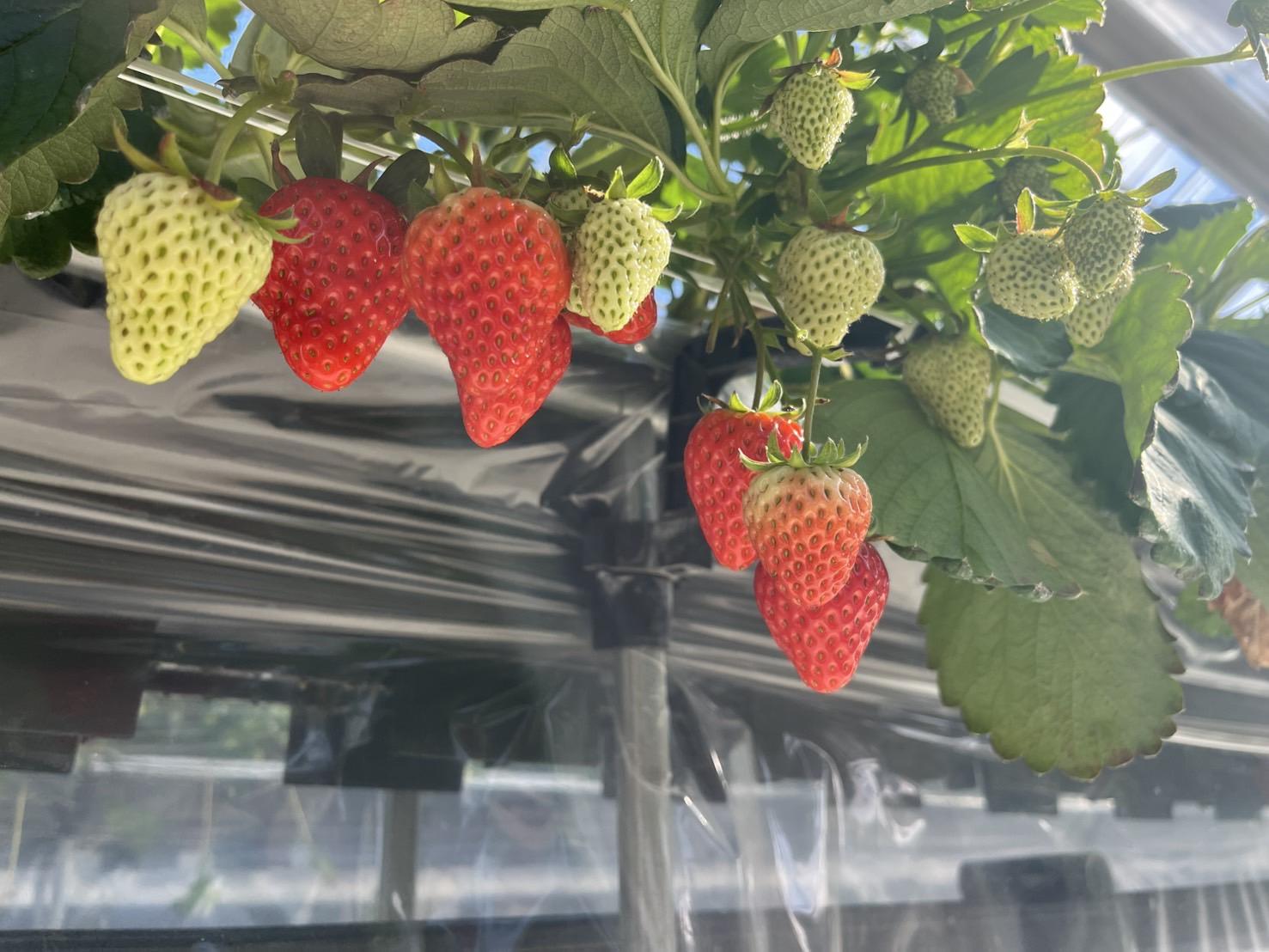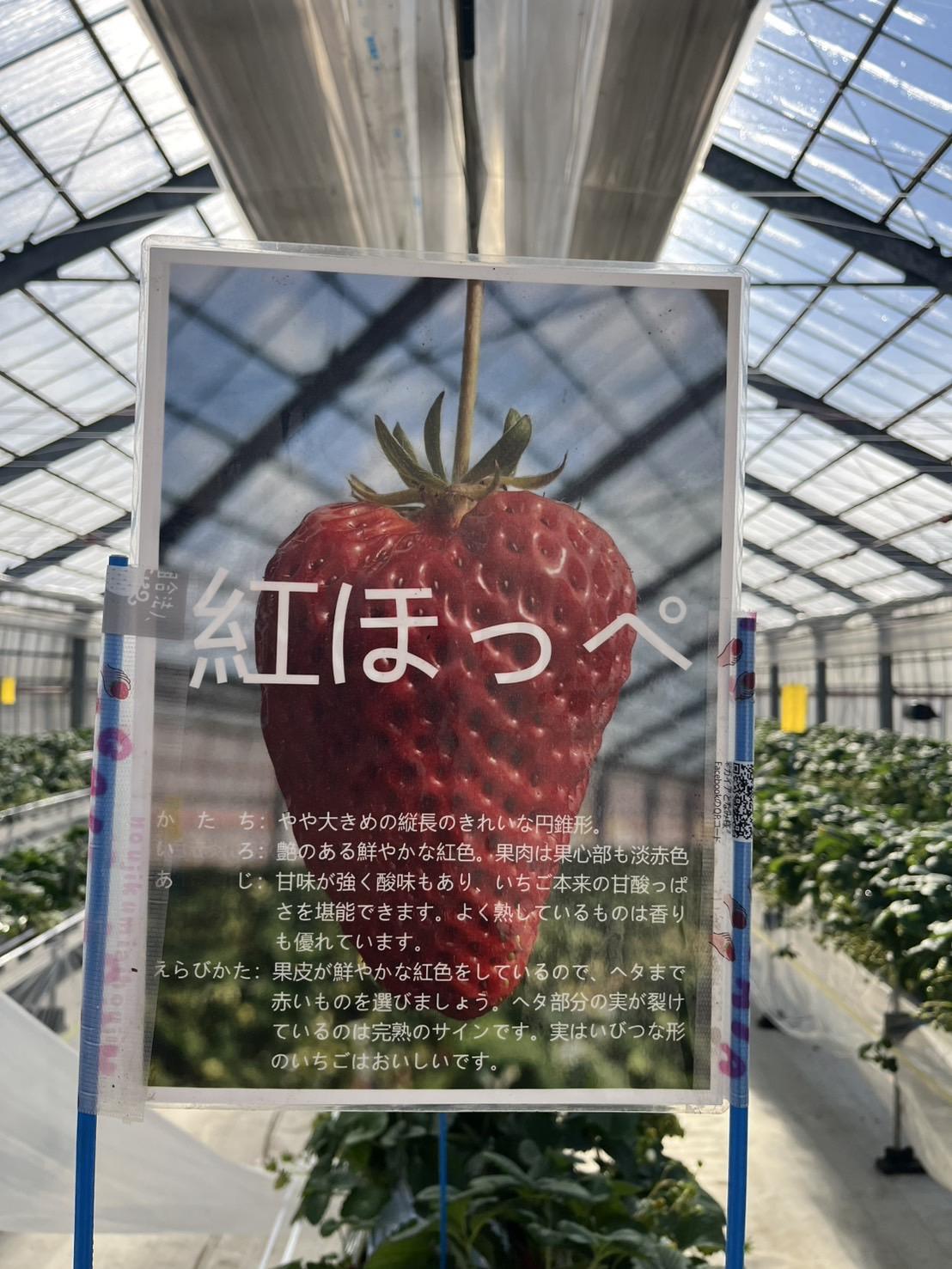 今回の体験はシーズン営業開始一週間前の冬で、「紅ほっぺ」、「あきひめ」、「恋みのり」の3品種が摘み取りの対象でした。冬は日照時間が少ないことから、通常の30日よりも長い50日程度をかけてじっくりと育てています。そのぶん味が濃厚になり、サイズも大きくなるのだそう。きれいな形よりも、いびつな形の方が美味しいとのことで探し回り、まずは一番人気の「紅ほっぺ」を口にしました。