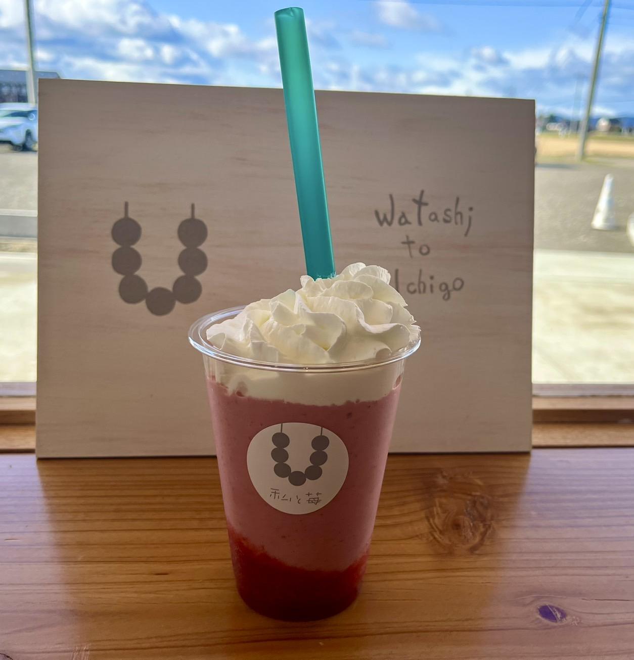 体験後は2024年に新築された直売所兼カフェでイチゴのスムージーをいただきました。目が覚めるほどの新鮮な味わいで、スムージーの紅色とクリームの色合いがオシャレに映えており、女性受けしそうな一品。このほかイチゴが器いっぱいに敷き詰められたパフェなどもあり、体験の後やカフェのみの利用もおすすめです。