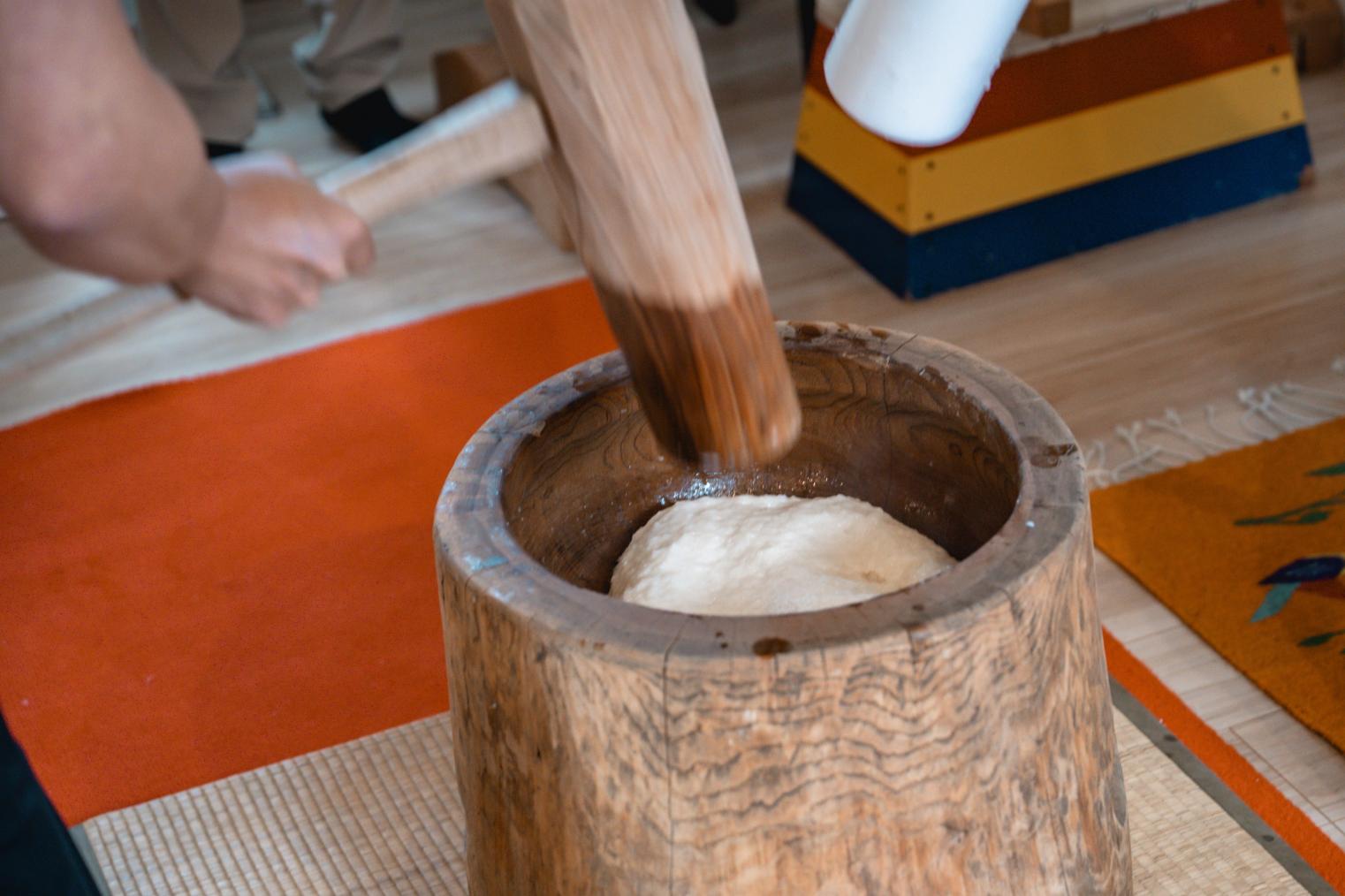 ここでは臼と杵を使って、炊き立てのもち米から自分たちでお餅をつく体験ができます。