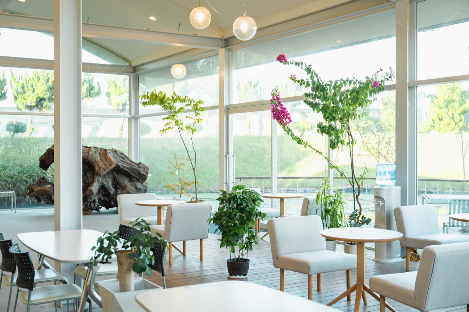 店内は大きな窓が設置された開放的な空間で、緑に囲まれて心地よい時間を過ごすことができます。
