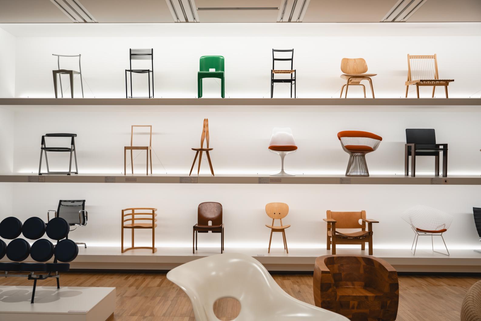 ずらっと壁一面に並んだ椅子のコレクションも圧巻。実際に座って座り心地を確かめることができるものもあるので、訪れた際は要チェックです。