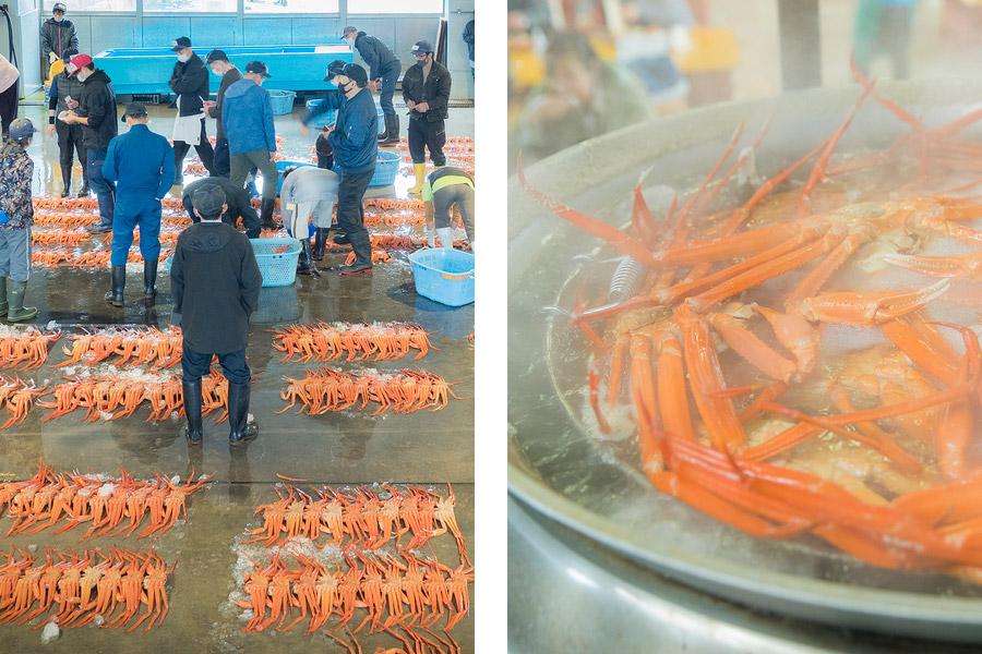 新湊漁港から歩いて2分の場所に、茹でたての紅ズワイガニを丸ごと1杯の姿で提供する「新湊かに小屋」があります。ここで働くのは、地元の水産加工会社「鷲北水産加工」でかにを茹で続けて40年というベテランの職人さんや、新湊の浜育ちのパワフルなお母さんたち。「カニは子どものころから夕飯前におやつで食べていたの。身を出すのも1杯1分もかからずにできるわよ」と、スタッフの作道(つくりみち)さん。地元の人たちにとって、茹でガニは温かいのが当たり前だそうで「ジューシーなカニのエキスも、温かいほうが美味しいの」と話します。