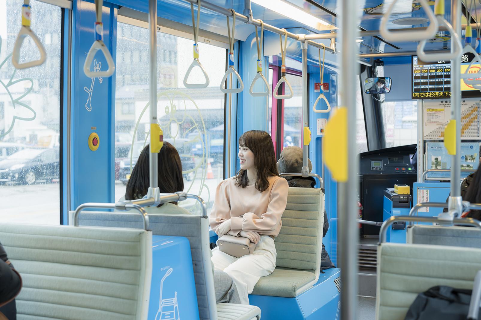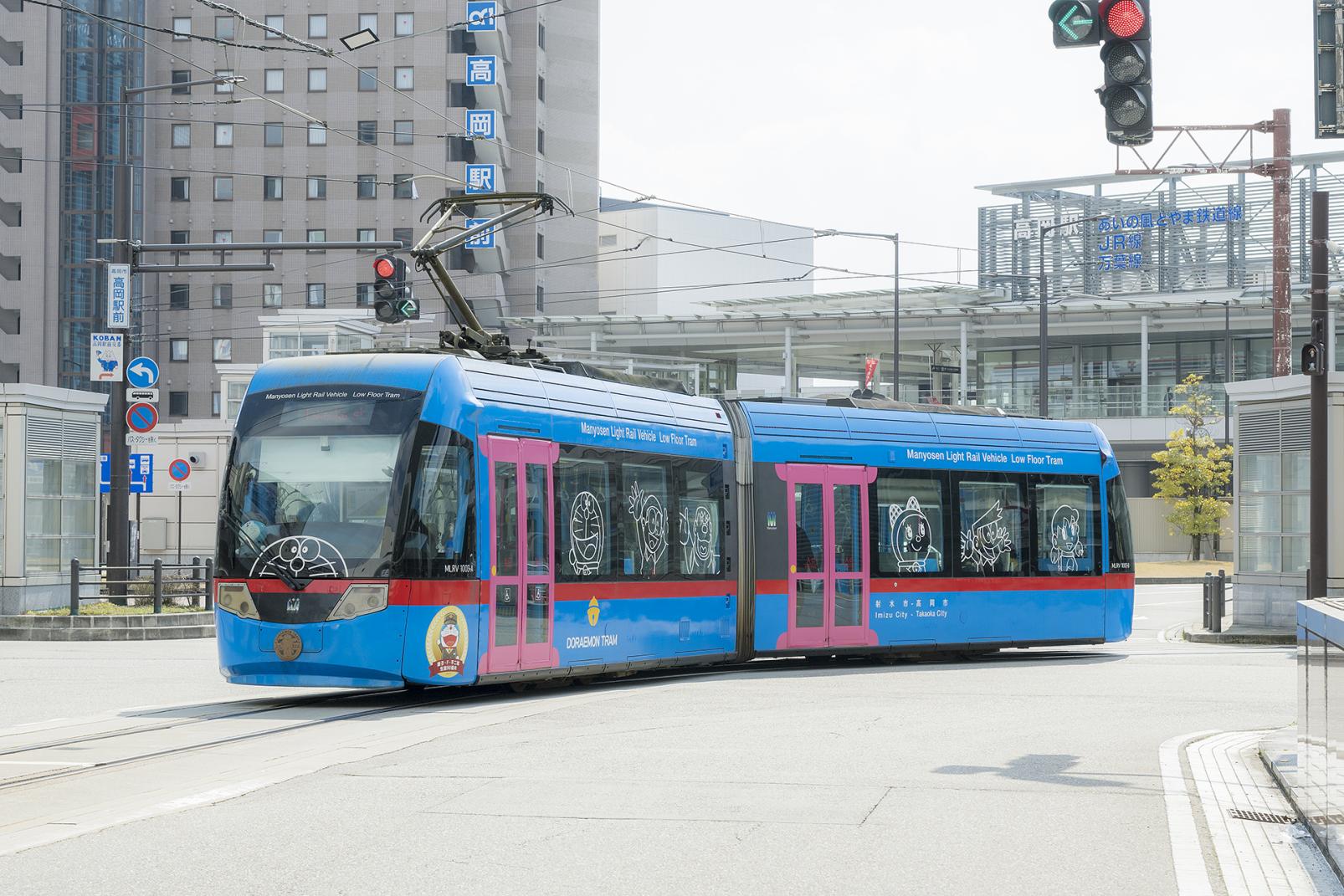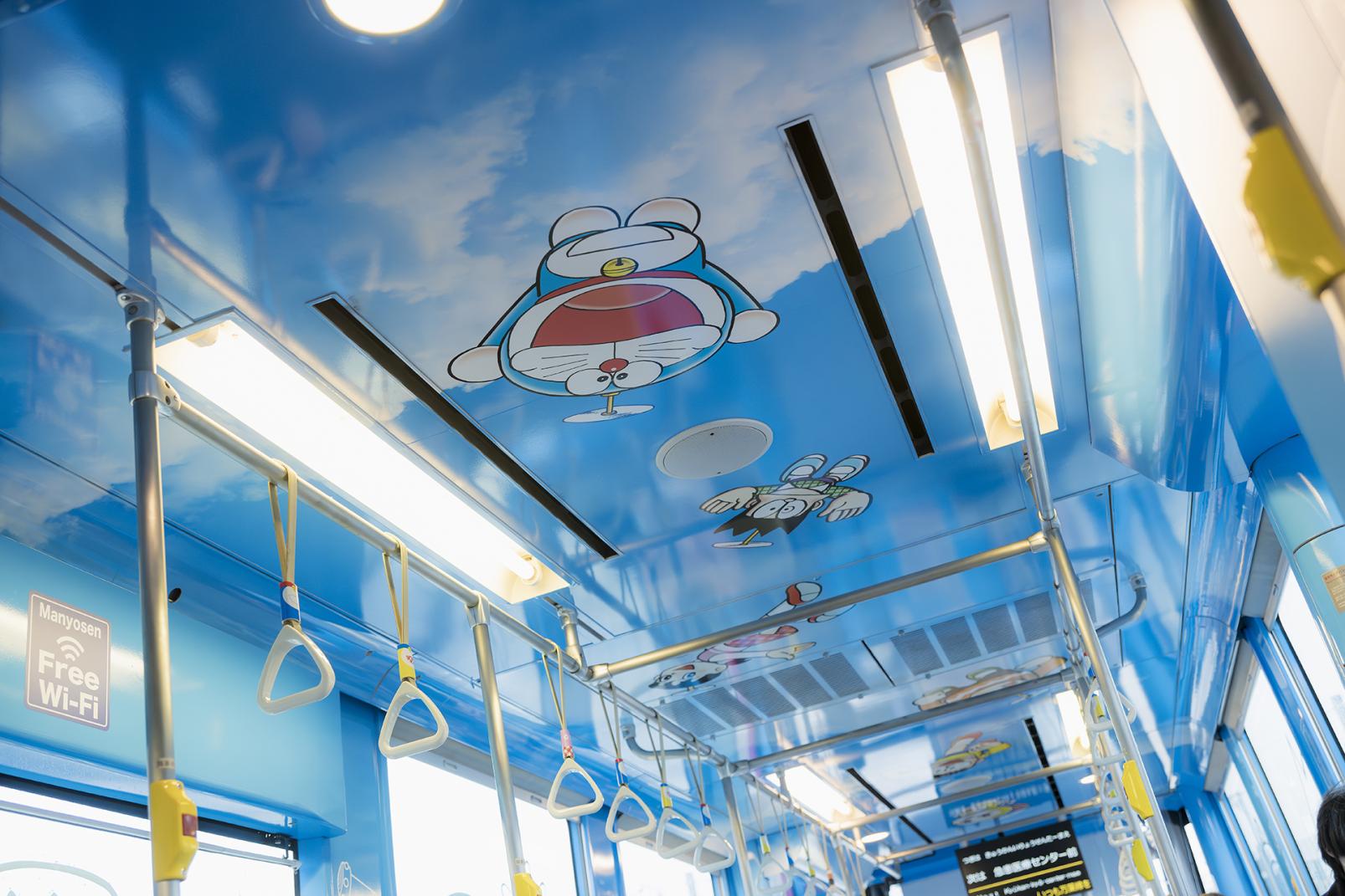 高岡市と射水(いみず)市を結ぶ万葉線の「ドラえもんトラム」は、累計乗車人数が100万人を超す人気の電車。ドラえもんの世界観を表現した内装や外装が、路面電車にデザインされています。