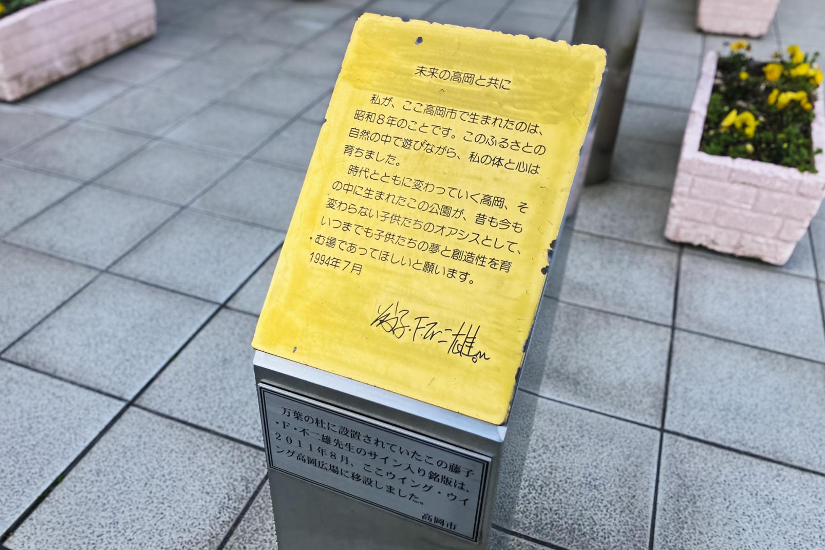 ドラえもん像の側には、藤子・F・不二雄先生からの温かなメッセージも刻まれていて、自然豊かな高岡で育ったからこそ、たくさんの人に愛されるドラえもんが生まれたことが伝わってきます。また言葉からは、子どもたちの夢や創造性を大切にしたいと願う藤子・F・不二雄先生のやさしい人柄も感じられます。