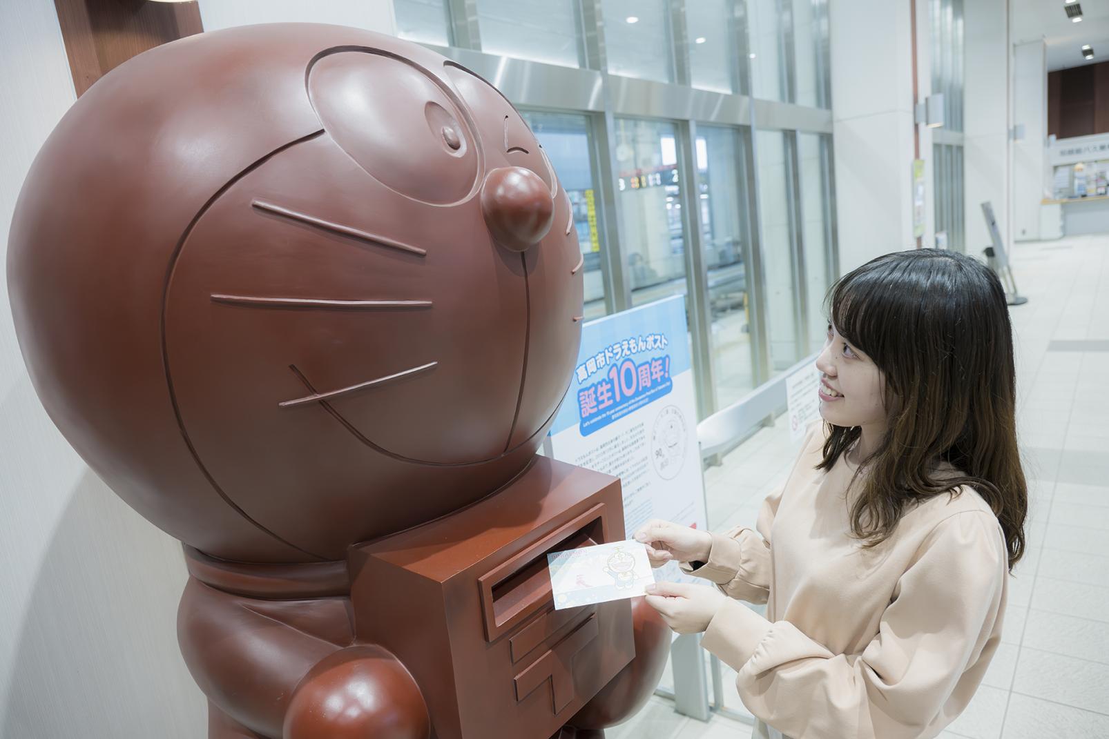 高岡駅にある万葉線の待合室の中に、藤子・F・不二雄先生の生誕80周年の際に作られた高岡銅器製の高さ2mのポストがあります。ここから投函された郵便物には、ドラえもんの記念消印が押され、年によってデザインが変わることも魅力。